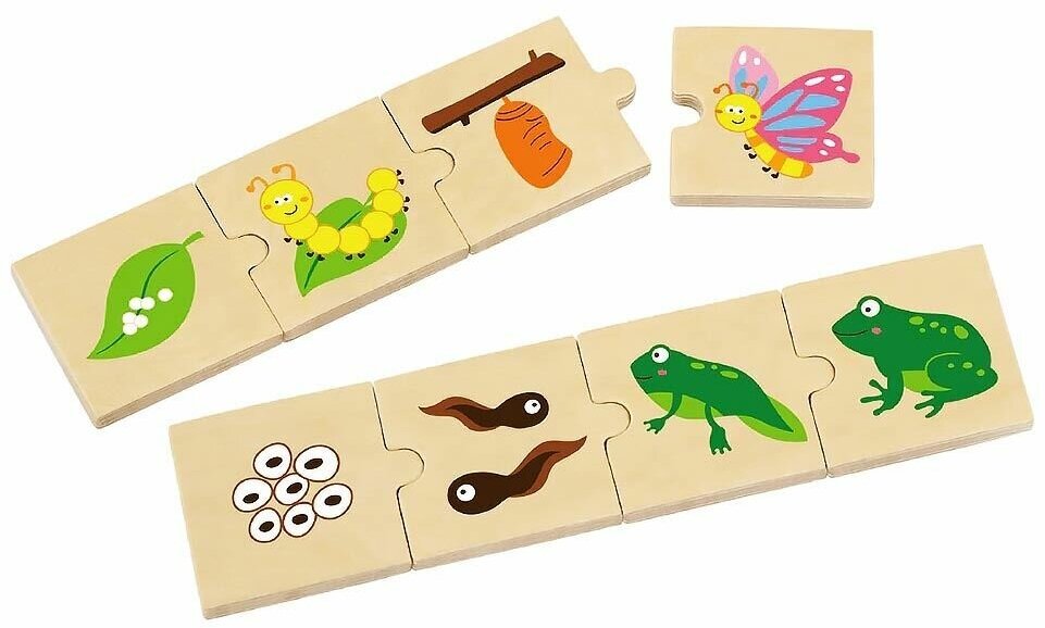 Набор состоит из 24 отдельных элементов с изображением различных фаз развития животных, насекомых и растений. Элементы нужно рассортировать по категориям и собрать в мини-пазлы. Выполняя задание, ребенок развивает мышление, логику, координацию работы рук и глаз, а также получает представление об основах биологии.
