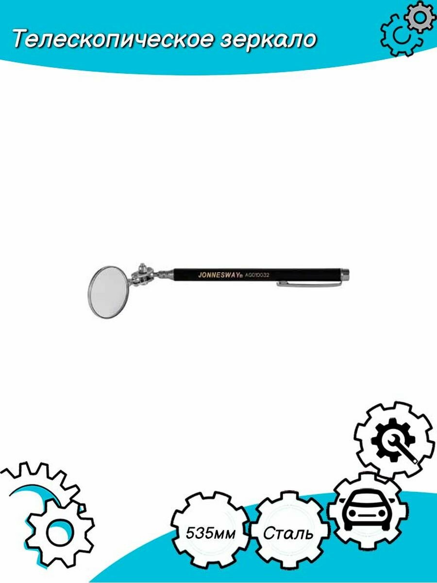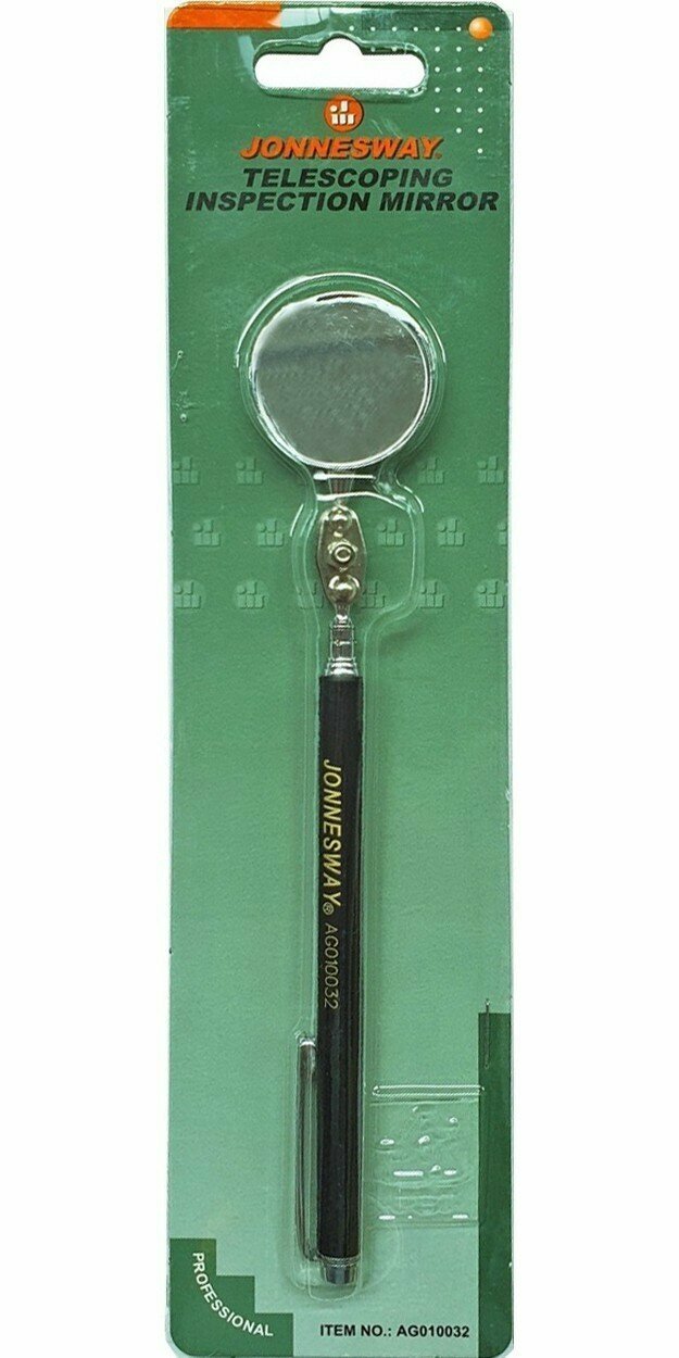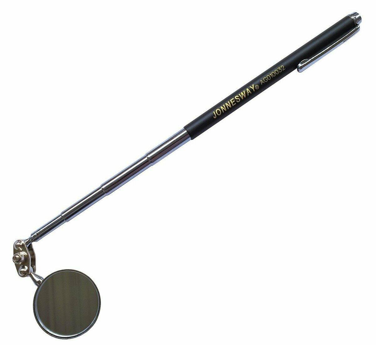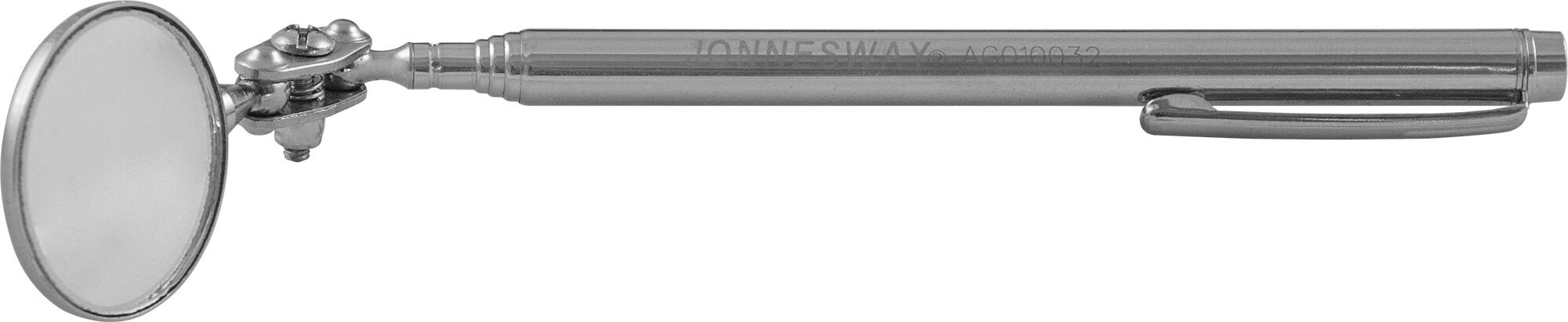 Круглое зеркало в металлической оправе, диаметром 32 мм, установленное на шарнире, закрепленном на телескопической стреле. Применяется для визуальной диагностики узлов и агрегатов в труднодоступных местах. Для удобства хранения инструмента в кармане, рукоятка снабжена зажимом.