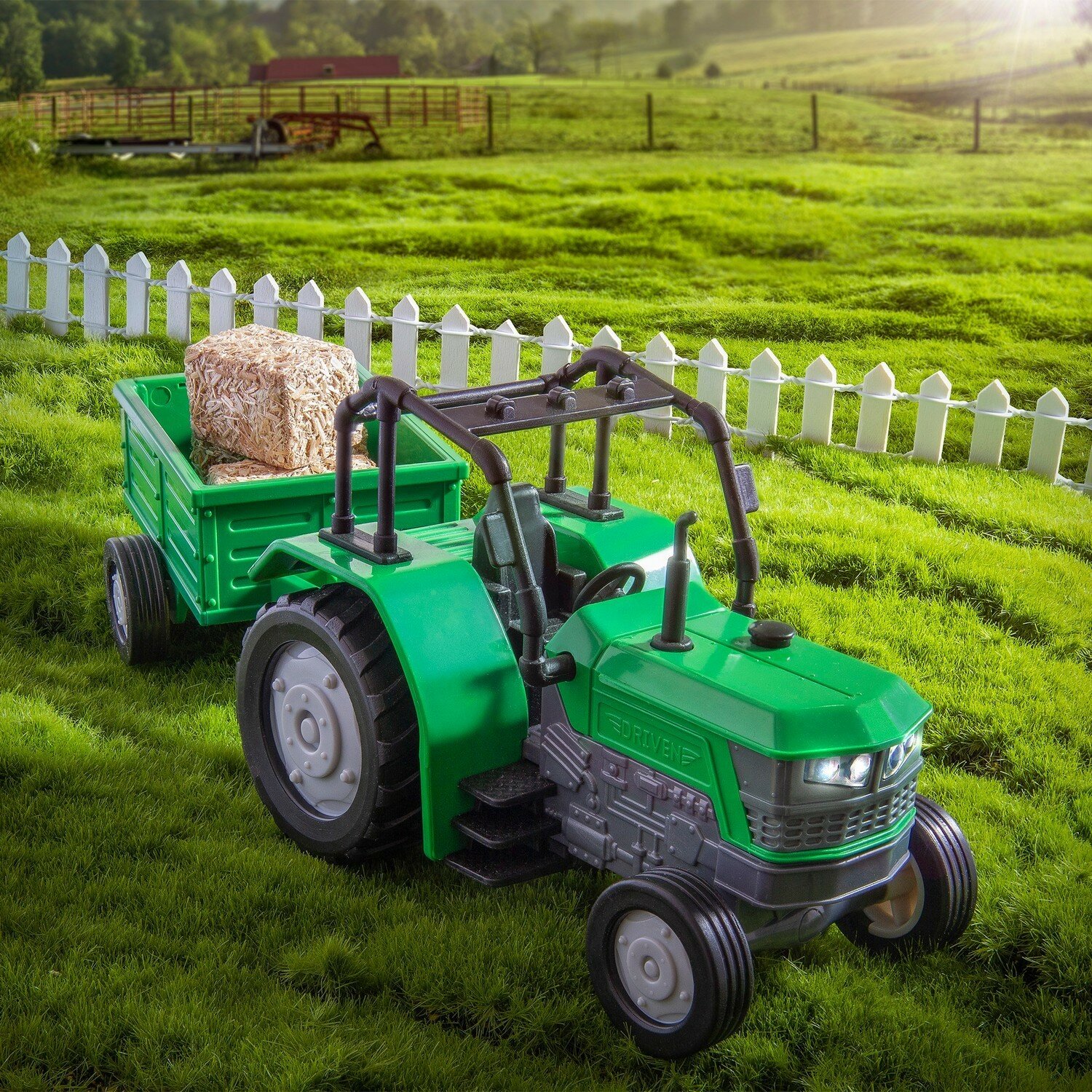 Очень удачный трактор с прицепом. Мой ребенок возит в этом прицепе все, что помещается. Прицеп легко отсоединяется, при этом не деформируются никакие элементы. С трактором Driven Micro играем уже больше двух месяцев, все детали целы и невредимы, световая подсветка красивая, а звук слишком громкий. Детализацию хотелось бы видеть точнее.