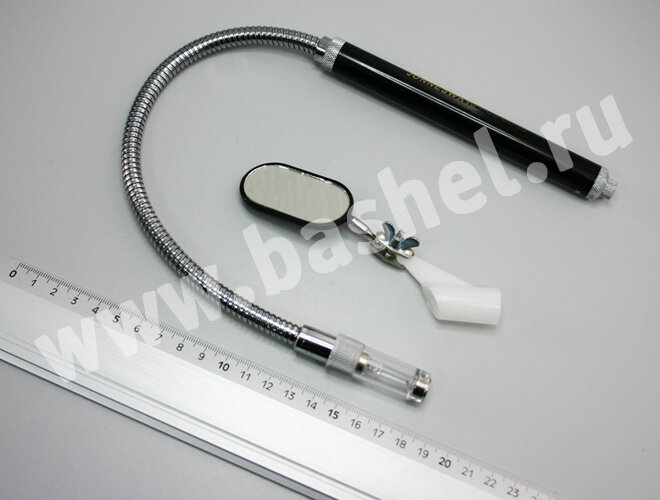 Инструмент, применяющийся для подсветки труднодоступных участков и извлечения железосодержащих деталей, массой до 0.4 кг. Дополнительно, на патрон устанавливается зеркало прямоугольной формы, 25х50 мм, для визуальной инспекции затемненных труднодоступных мест. В рукоятку устанавливаются 2 элемента питания типа ААА. Лампочка накаливания линзованная, патрон Е10, 2.2 в, 0.25 а, типа Mactronic.