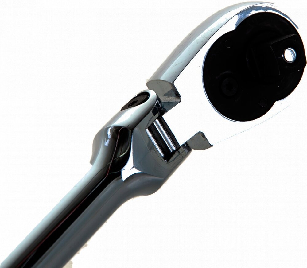 Трещоточная рукоятка с подвижной на 180град. в шести позициях одной плоскости головкой. Применяются при производстве работ со слабонагруженными резьбовыми соединениями. Не имеют альтернативы (за исключением трещоточных ключей) при использовании в ограниченных рабочих пространствах. По основным характеристикам аналогична изделию R29, но имеет зеркальное хромоникелевое покрытие.