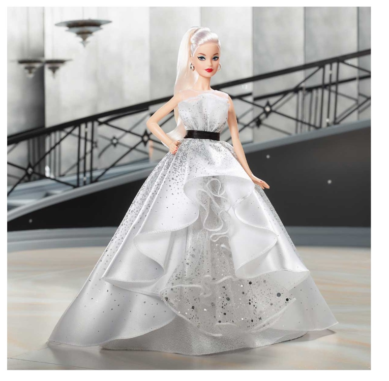 Кукла Barbie 60th Anniversary (Барби 60 летний Юбилей) / Коллекционная кукла Барби В комплекте: Барби, платье, туфли, украшения, подставка, упаковка Глаза: голубые Волосы: белые Ресницы: нарисованные Тип тела: Model Mus Лепка головы: Barbie closed mouth Collector DYX39 Серия: Чёрная / Black Label Дизайнер: Caroline DeMersseman Оригинальное название: Ball 60th Anniversary Doll Артикул производителя: FXD88 В течение 60 лет Barbie удивляет и радует поклонников во всем мире. В честь ее 60-летия компания Matell выпустила юбилейную Барби в роскошном платье серебрянного цвета, украшенным серебристыми блестками. Специально разработанная упаковка, посвященная 60-летию, делает эту куклу идеальным подарком для коллекционеров и любителей. Отпразднуйте 60-летие куклы Barbie! (Цвета и украшения могут отличаться)
