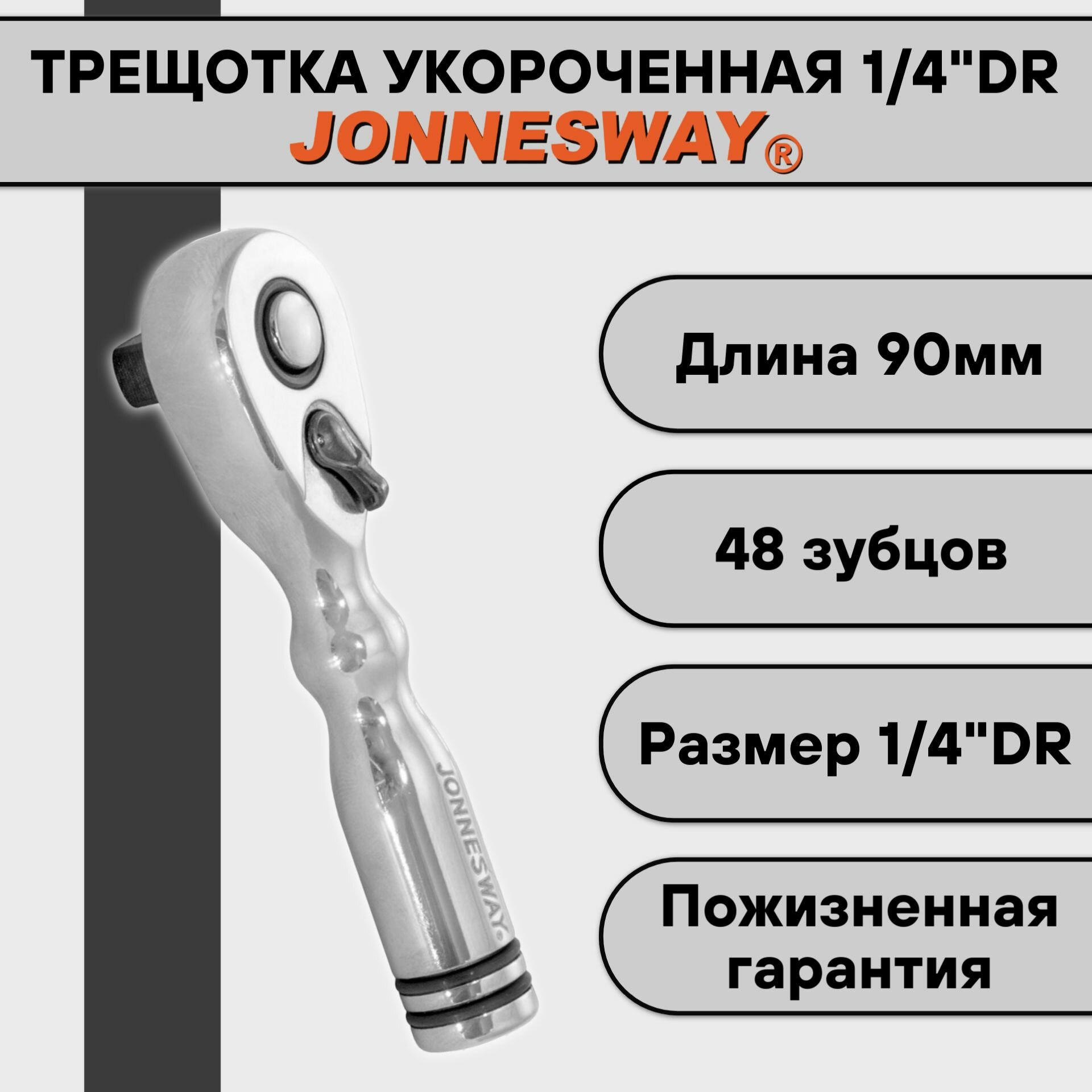 Трещотка короткая Jonnesway 1/4"DR имеет длину всего 90 мм, отлично подходит для работы в ограниченном пространстве. Она передает вращение торцевым головкам с размером 1/4 дюйма. Инструмент изготовлен из хромованадиевой стали и покрыт хромом для долгого срока эксплуатации. Малый вес способствует меньшей утомляемости при работе. Утолщенная рукоятка удобно лежит в руке.