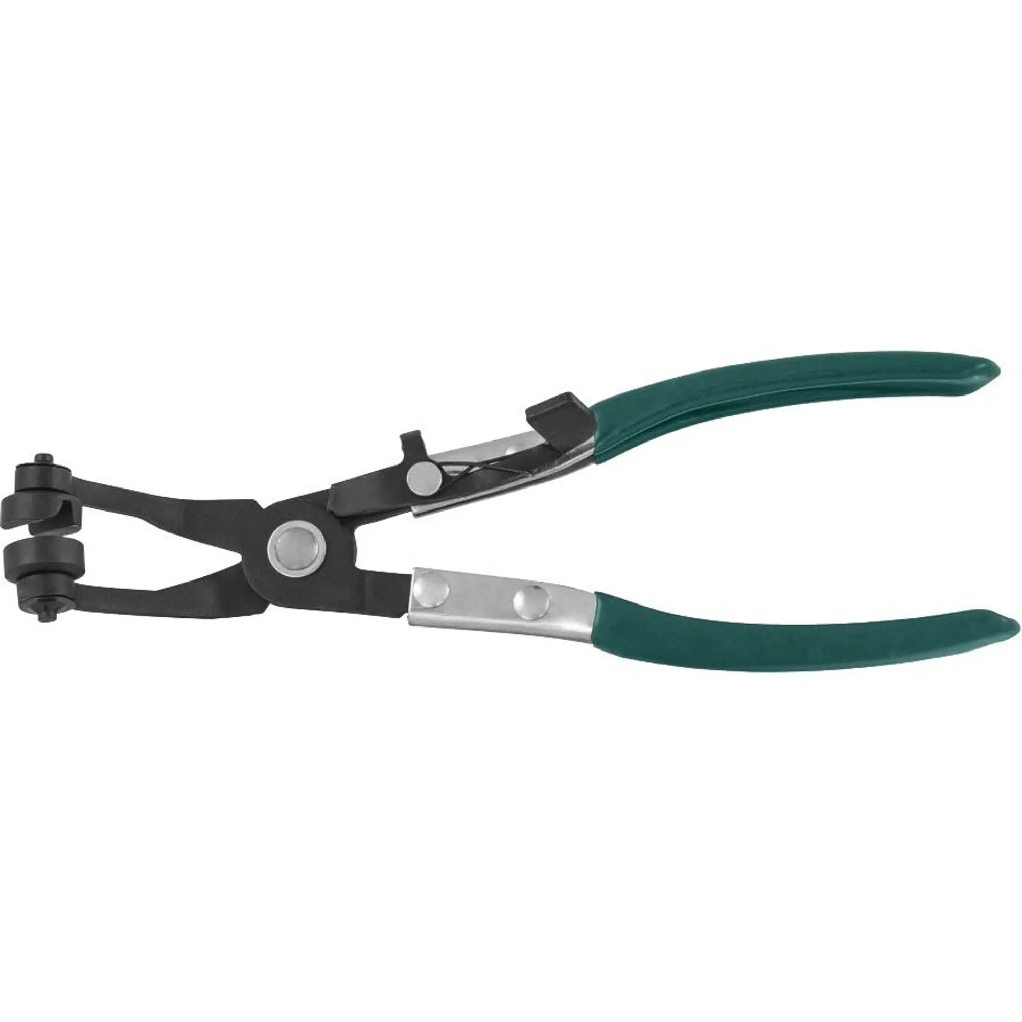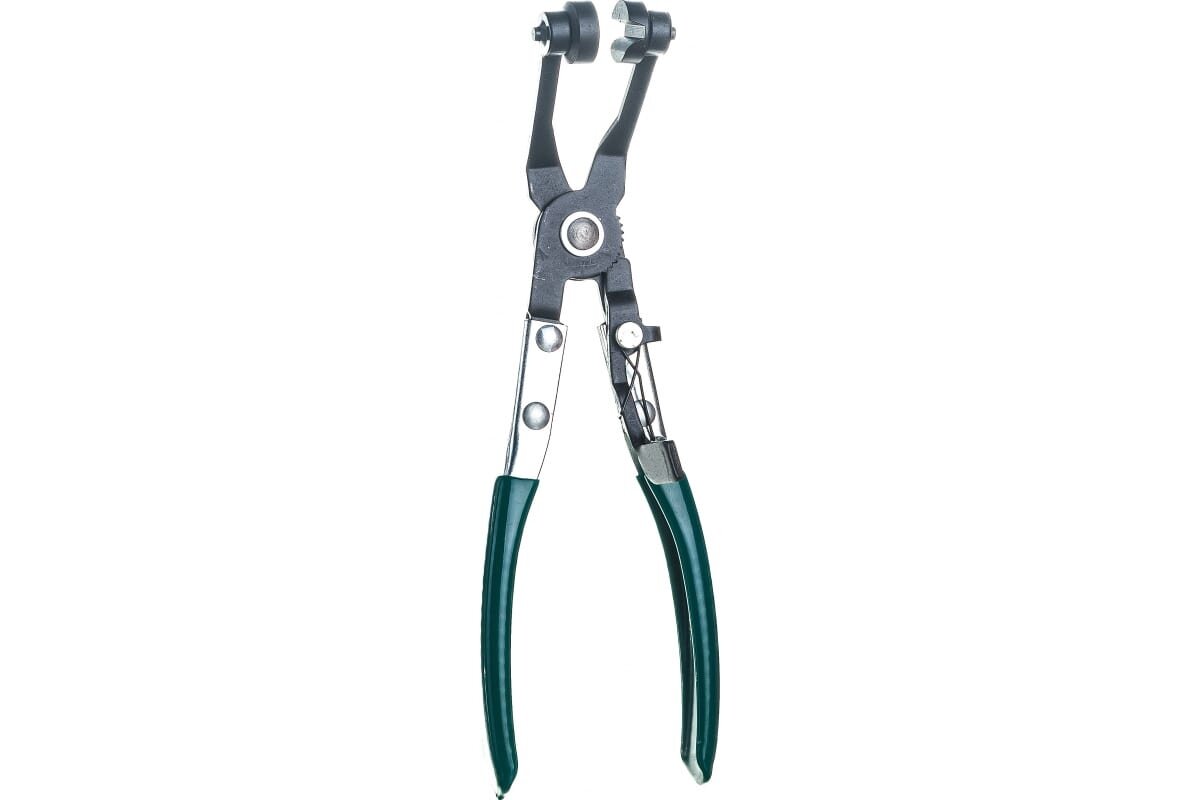 Инструмент применяется для снятия пружинных хомутов систем охлаждения в сложных для доступа местах. Захваты с V-образными канавками, лучше всего подходящими для удержания плоских хомутов, свободно вращаются вокруг своей оси. Рукоятки инструмента снабжены фиксатором положения губок, освобождающим оператора от необходимости постоянно их удерживать. Изделие изготовлено из стали, имеет защитное покрытие - фосфатирование и обливные ПХВ чехлы рукояток.