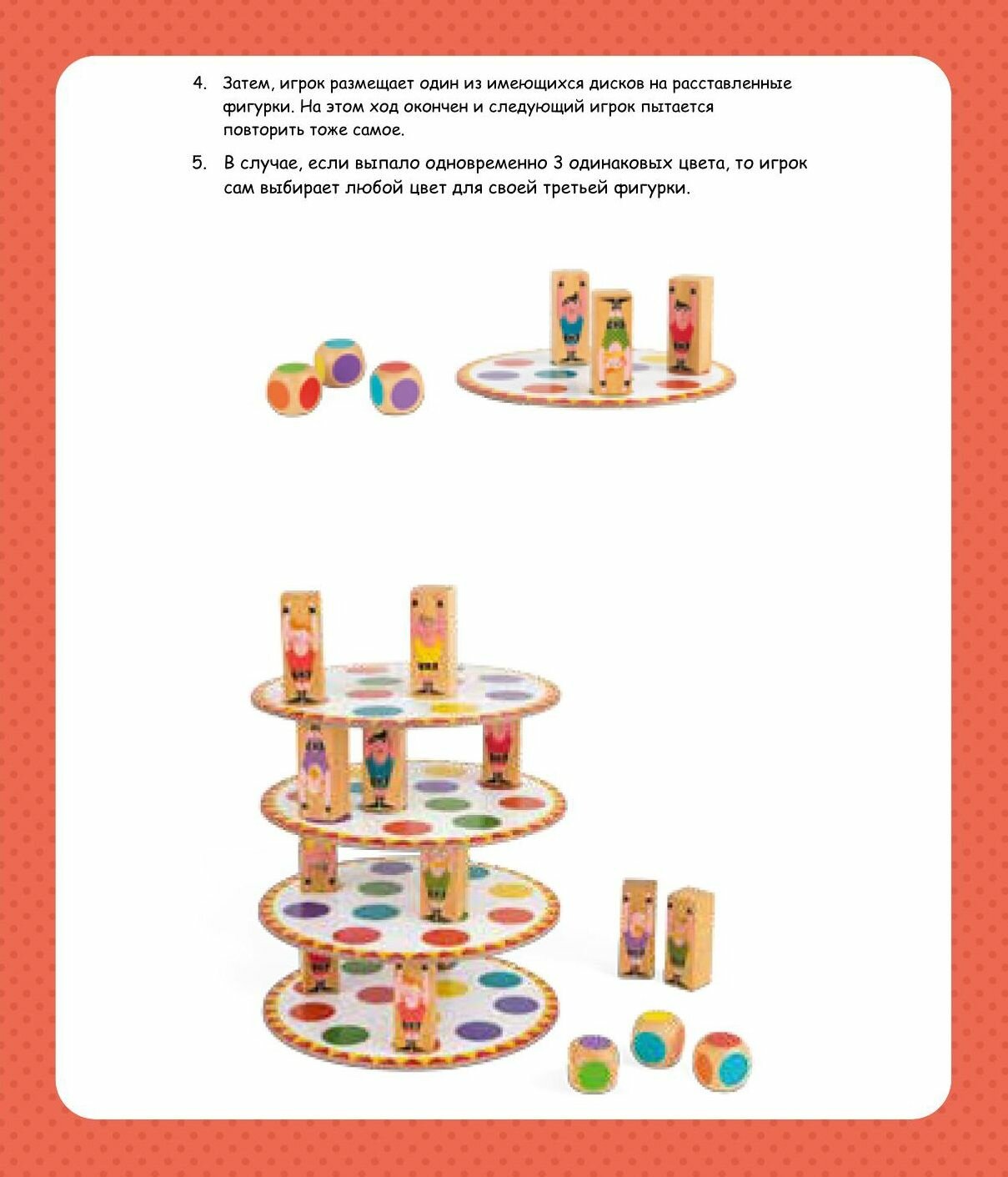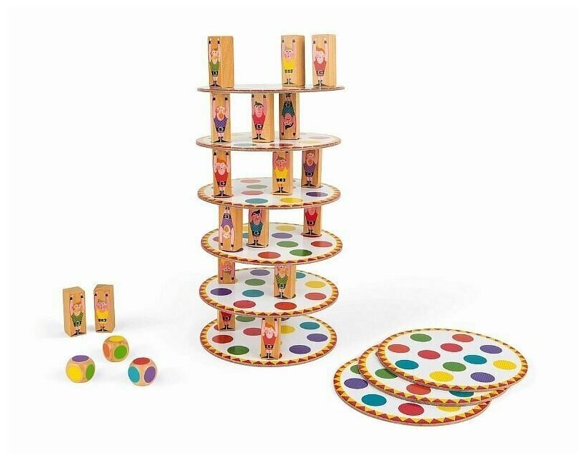 Настольная игра на ловкость и смекалку от Janod. Играть могут несколько игроков - от 2-х до 8-ми. Каждый игрок по очереди бросает игральные кубики и расставляет свои фишки на основе соответствии с цветом, показывающие кости. После каждого хода игроки устанавливают диск, образуя новый «этаж». Цель игры - построить как можно высокую башню, а на ком из игроков она упадет - тот проиграл. Игра развивает восприятие цветов, моторику рук, стратегические навыки. Рекомендуемый возраст: 5+