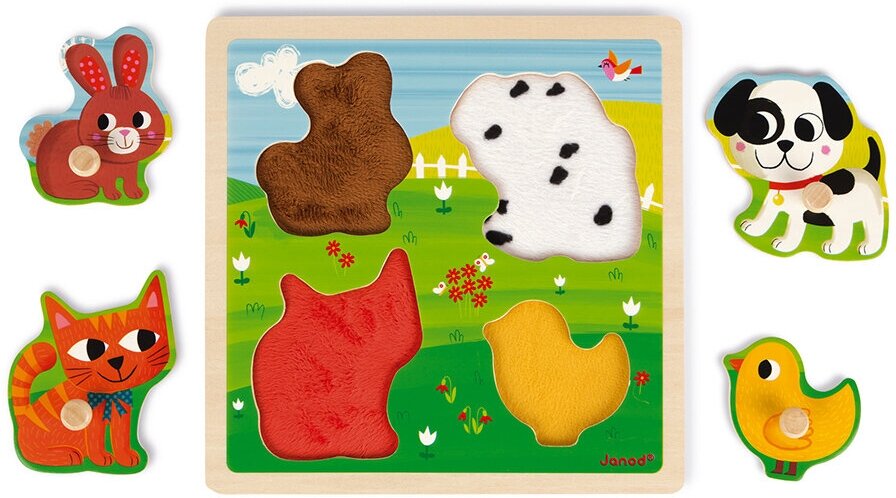Текстурный пазл-вкладыш Janod предназначен для самых маленьких. В деревянной рамке вырезаны четыре контура, внутри которых текстильные текстуры, соответствующие животным. На лицевой части каждого вкладыша деревянная ручка. Играя, ребёнок развивает координацию и моторику, логическое и образное мышление.