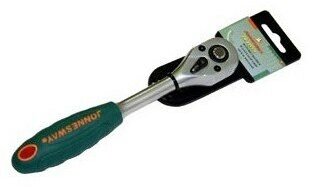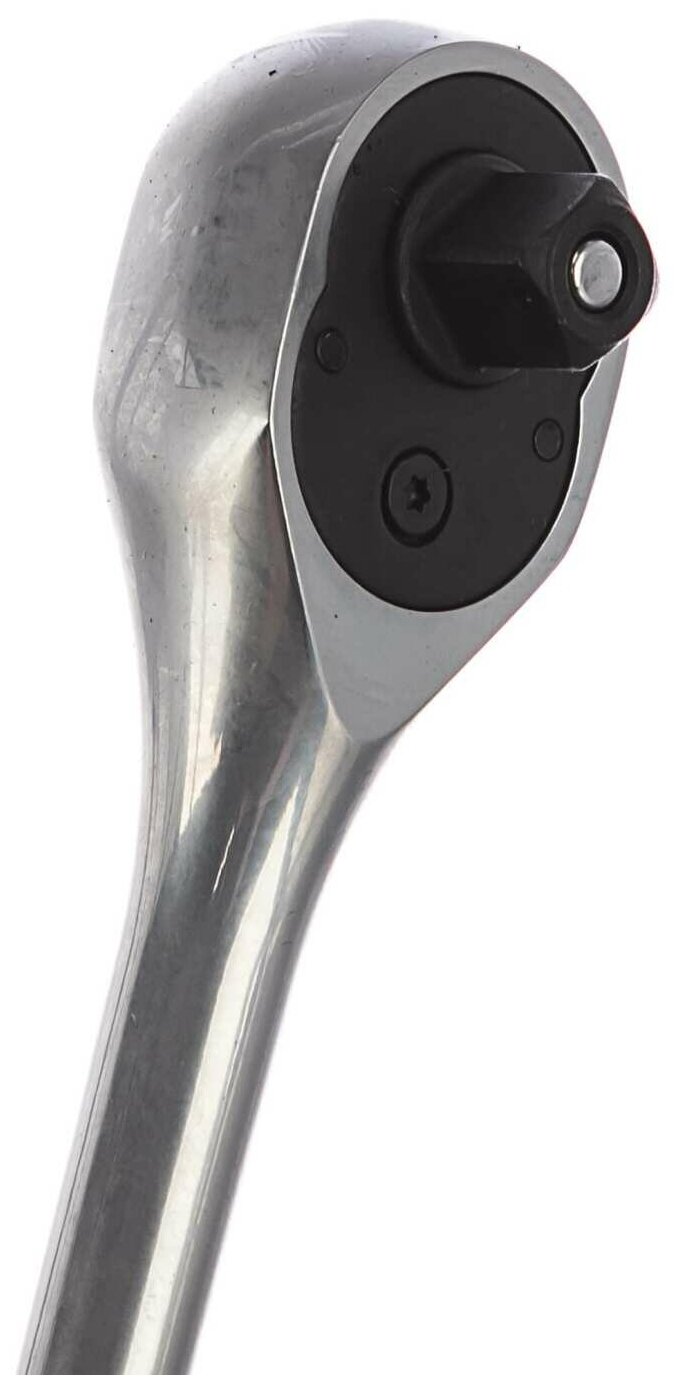Трещоточная рукоятка с флажковым переключателем и композитной ручкой с мягким, "сатиновым" покрытием, обеспечивающим надежное удержание инструмента увлажненной или загрязненной рукой. Устройство быстрого сброса надежно фиксирует насадку на приводе и легко от нее освобождается одним нажатием.