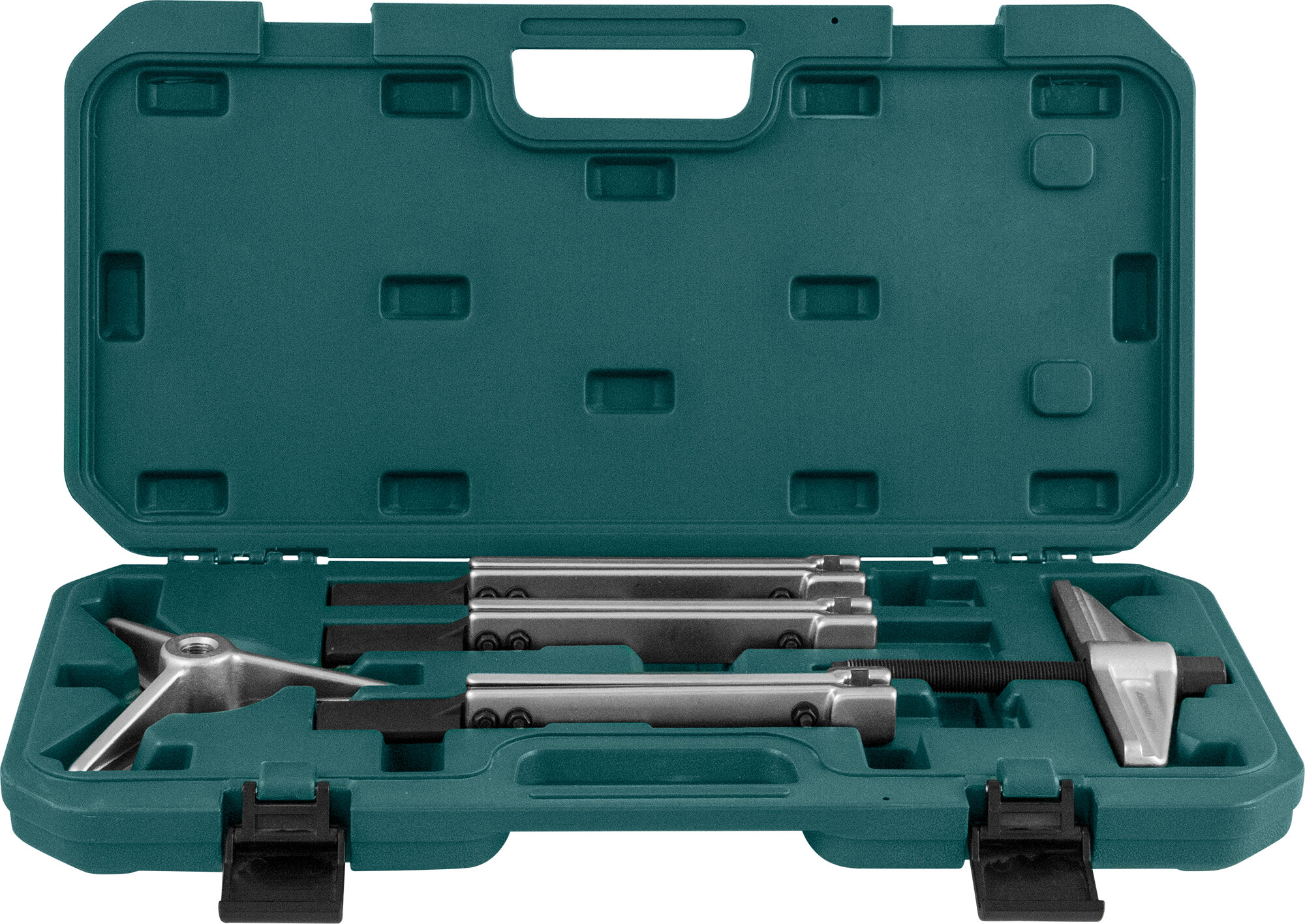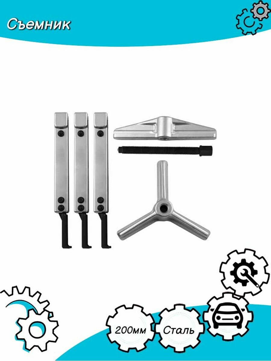 Съемник со скользящими составными захватами, откованными из двух марок легированных сталей, износостойкой для лапок захвата и высокопрочной для направляющих. Набор комплектуется двумя траверсами, позволяющими применять, в зависимости от выполняемой работы, 2 или 3 захвата, диаметр захватываемой детали 40-120 мм.