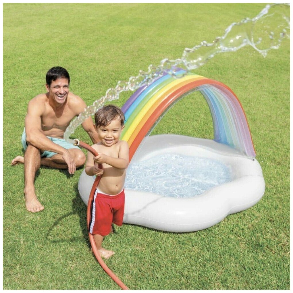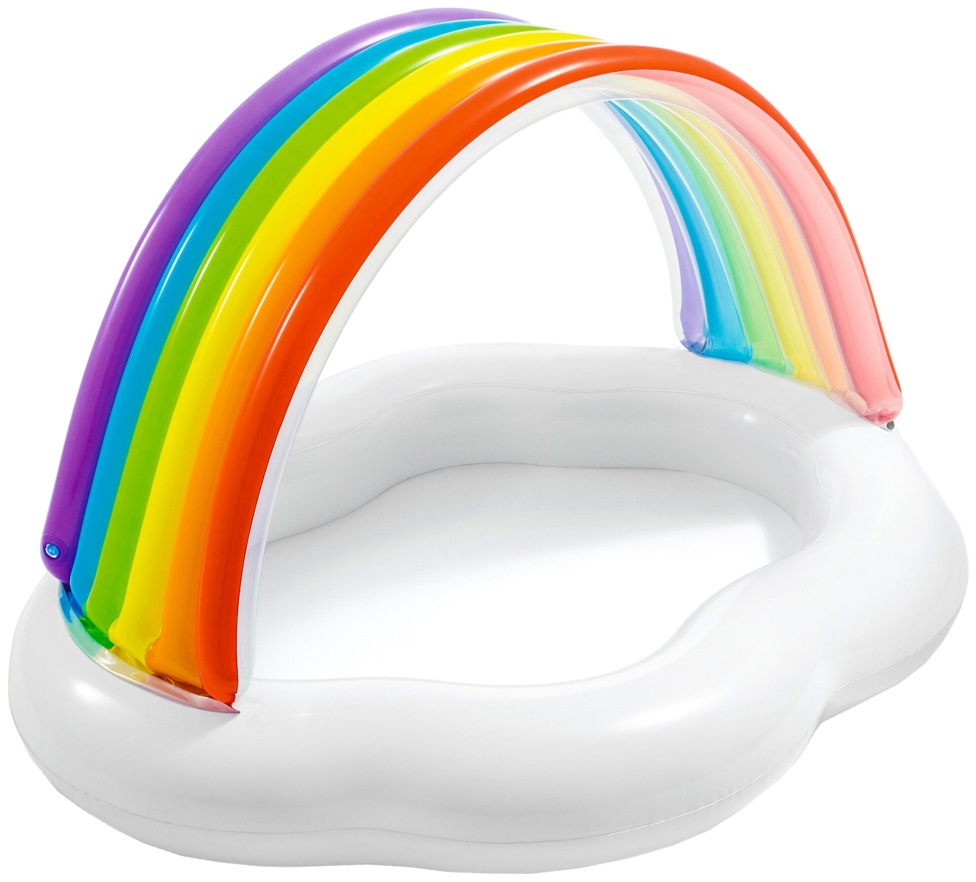 Бассейн надувной Intex 57141 для детей от 1 до 3 лет. Предусмотрен навес от солнца по типу радуги. Также тент от укрытия от прямых лучей солнца. Яркая радуга и необычная форма бассейна в виде облачка привлекут внимание даже самых капризных малышей. Можно быстро превратить в игровой центр, если заполнить емкость пластиковыми шариками. Низкие, широкие бортики высотой 13 см не позволят ребенку упасть.