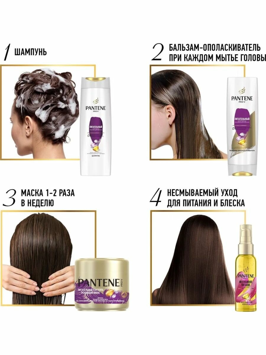 Шампунь, бальзам-ополаскиватель и уходовое средство 3в1 Pantene Pro-V "Питательный коктейль" очищает, облегчает расчесывание и восстанавливает волосы за одно применение. Заряжает волосы питательными веществами Pro-V. Комплекс Pro-V: способствует мгновенному устранению признаков повреждения. Антиоксиданты: помогают предотвратить ломкость. Липиды: восстанавливают волосы, поддерживая целостность их структуры.
