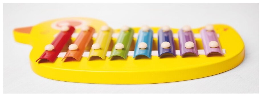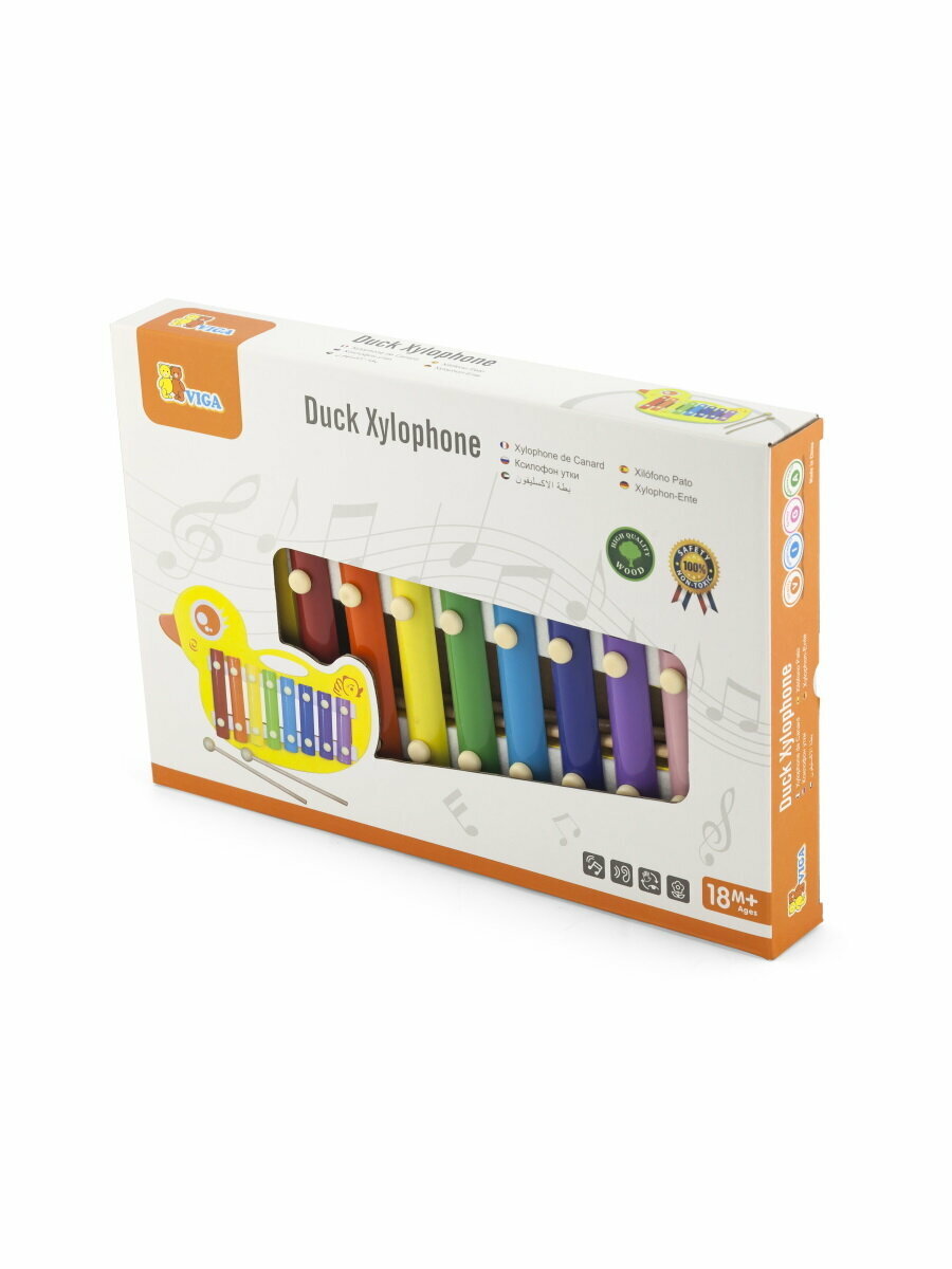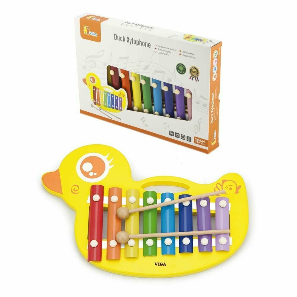 Размер: 32 х 21 х 3 см. Музыкальная игрушка Viga Toys Ксилофон-утенок – версия ударного инструмента, разработанная для малышей от 18 месяцев. Рекомендована для детских садов и центров развития. Эта веселая развивающая игрушка выполнена в виде симпатичного ярко-желтого утенка. Состоит из однотонной деревянной основы и разноцветных металлических пластинок. К набору прилагаются удобные деревянные палочки с наконечниками в виде шариков. При стучании им по пластинкам инструмент издает чистые звонкие звуки. Музыкальная игрушка Viga Toys Ксилофон-утенок приносит ребенку не только море творческой радости, но и максимум практической пользы. Во-первых, у малыша развивается слух и чувство ритма. Он пробует творить мелодии: имитировать и воспроизводить различные звуки, сочетать их. Во-вторых, активно стуча палочками по пластинам, ребенок укрепляет кисти рук, тренирует зрительно-моторную координацию и моторику пальцев. И, самое главное, благодаря музыке малыш развивается эмоционально, становится более коммуникабельным и раскрепощенным. Он начинает лучше слышать и понимать своих родителей, более эффективно взаимодействует с окружающими. Музыкальная развивающая игрушка Viga Toys Ксилофон-утенок выглядят эффектно и приятна на ощупь. Все края ее тщательно отшлифованы, углы сглажены. Основа выполнена из натурального материала – дерева. Ксилофон соответствует главным стандартам безопасности в сфере детских игрушек EN71, ASTM.