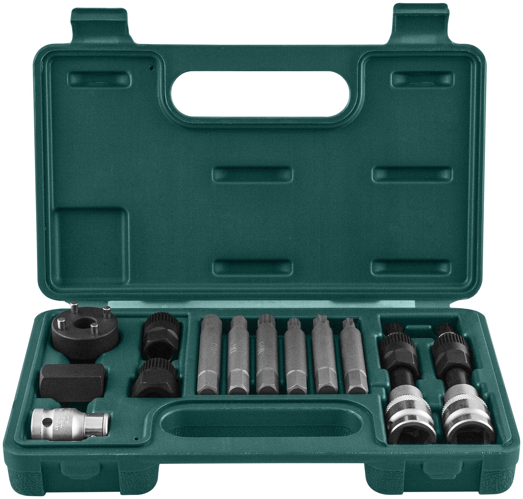 Набор инструментов, применяющихся для демонтажа ступичных резьбовых крепежных элементов шкивов генераторов автомобилей.
