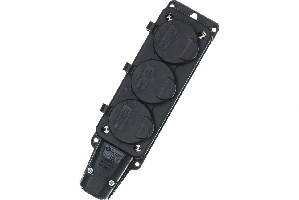 Каучуковая колодка 3 гнезда с з/к и крышкой 220В 16А, IP54, чёрная BEMIS BK1-1402-2613/3613 8698523906132 - комплектующая для сборки силового удлинителя. Изделие выполнено из прочного материала, не боится пыли и влаги, обладает повышенной электробезопасностью. Каждое розеточное гнездо оснащено защитной крышкой. Размеры: 5х7.5х16.5 см. Вес: 0,069 кг.