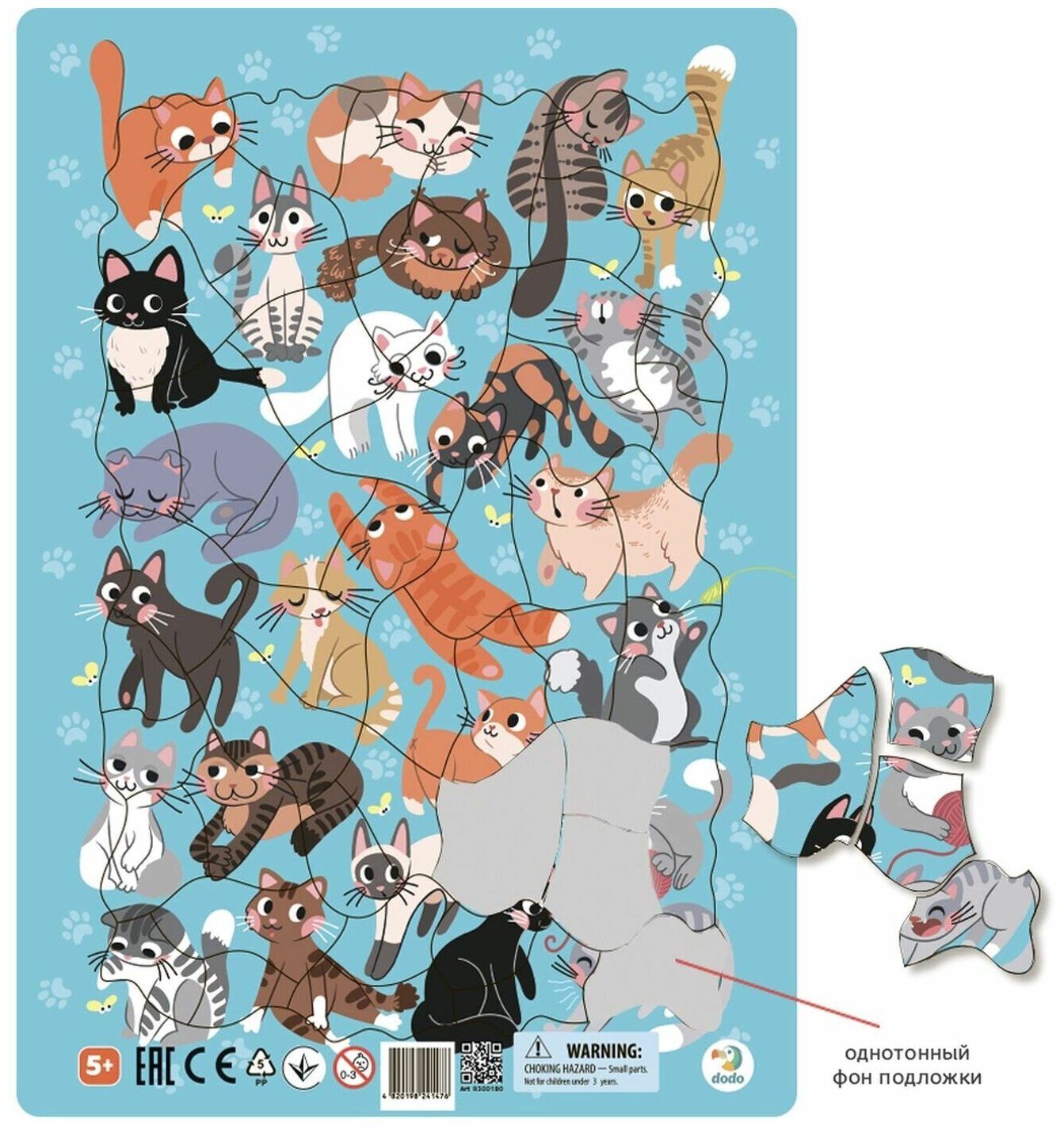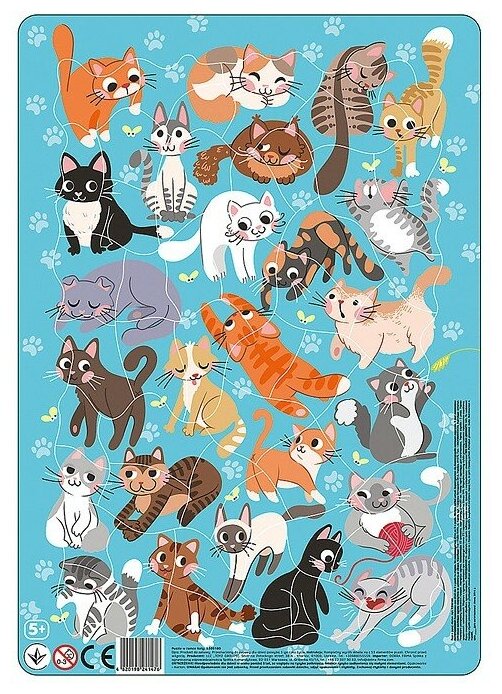 Пазл "Коты" состоит из 53 элементов и основной рамки-шаблона. Задача малыша: заполнить рамку недостающими фрагментами мозаики. В процессе игры активно работает логическое мышление, наглядное и образное восприятие, фантазия и воображение, мелкая моторика рук, внимательность и аккуратность.