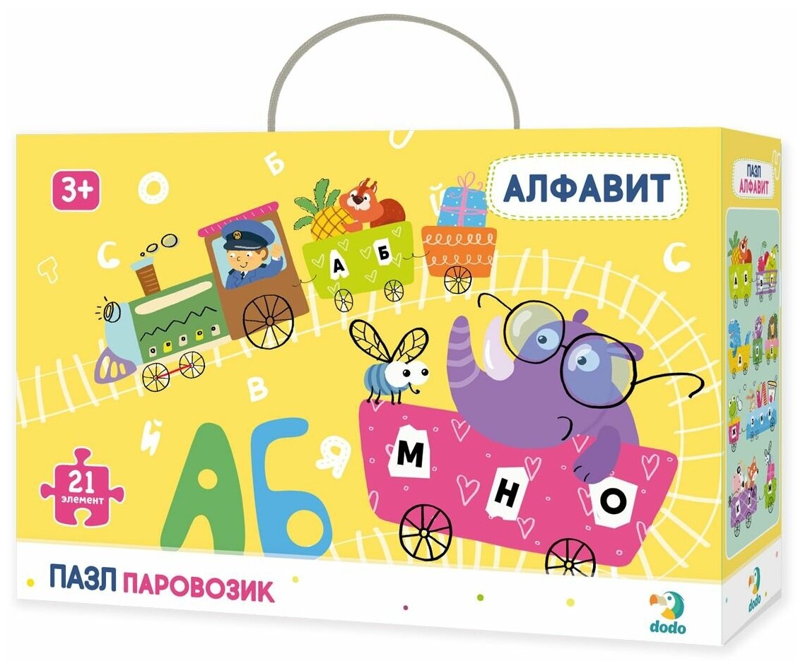 Dodo Пазл Паровозик Алфавит (21 элемент) интересен тем, что его детали в сложенном виде принимают форму красочного паровозика. На каждом из его вагонов написаны буквы русского алфавита. Чтобы малышу было легче их запомнить, вагончик везет предмет, который начинается на эту букву. В процессе игры малыш будет изучать внешний вид букв, запоминать их порядок в алфавите.