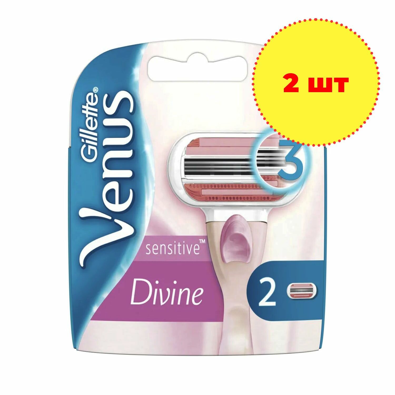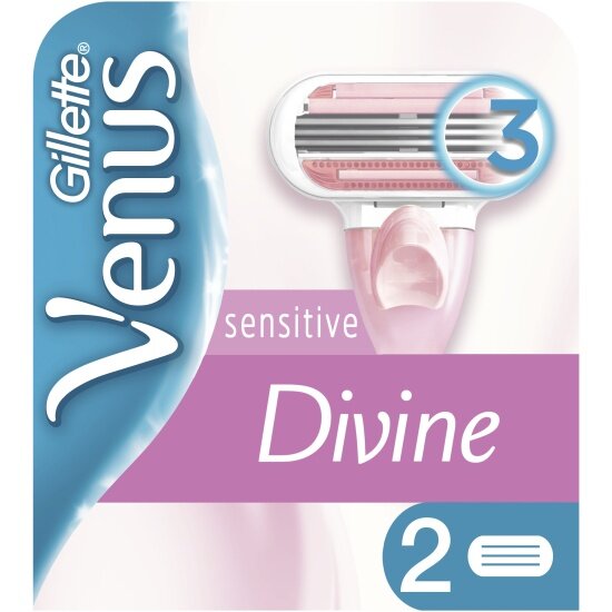Сменные кассеты для женской бритвы Gillette Venus Divine Sensitive оснащены тремя повторяющими изгибы тела лезвиями и активно увлажняющими полосками с растительными маслами для заботы о коже и гладкого, комфортного бритья.