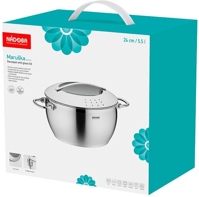 Посуда серии Maruska изготовлена из высококачественной нержавеющей стали 1810. Прочное трехслойное капсульное дно изделий служит для равномерного распределения тепла по всей площади посуды. Встроенный дуршлаг на крышках посуды серии делают процесс слива воды простым и легким. При этом для изготовления крышки использовалось термостойкое закалённое стекло. Надежные складные ручки позволяют хранить посуду серии Maruska одна в одной, что может существенно сэкономить пространство на кухне. А благодаря креплению ручек на точечной сварке и отсутствию заклёпок ничто не затрудняет процесс мытья посуды. На внутренних стенках посуды нанесена маркировка литража для простого определения необходимого объема воды и продуктов. Посуда серии Maruska может использоваться в духовке и подходит для всех типов плит, включая индукционные. Гарантия на всю посуду серии Maruska 10 лет.