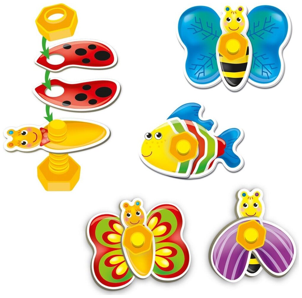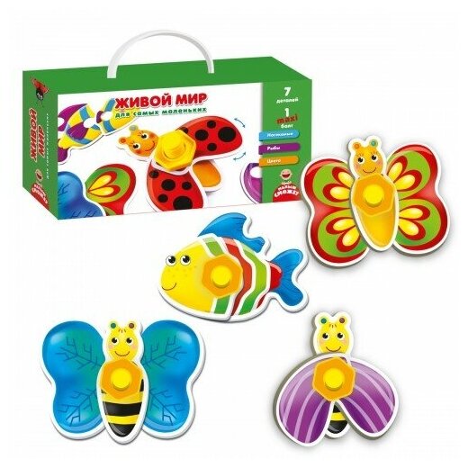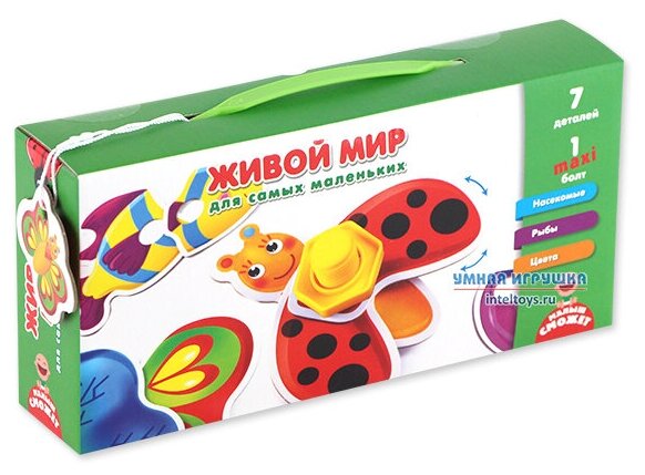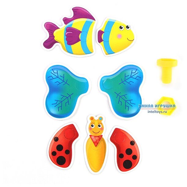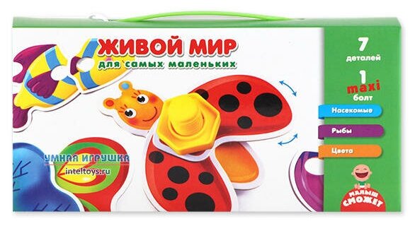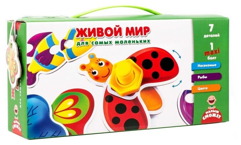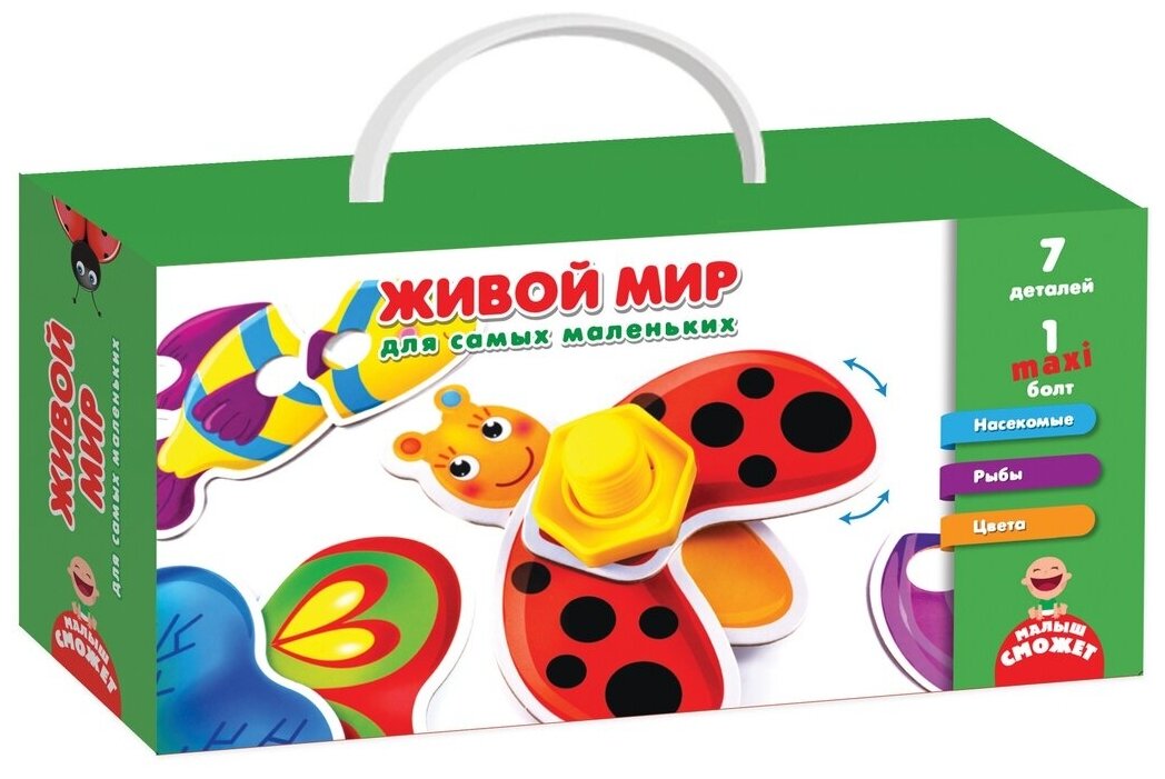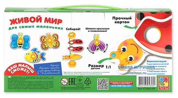 Vladi toys Развивающая игра Живой мир для самых маленьких Живой мир такой интересный и увлекательный! Изучайте его в необычной игровой форме. Разложите перед ребенком картонные детали и болтик с гайкой. Пускай малыш определит, какие детали нужны для жучка, а какие для рыбки. После этого по очереди конструируйте жучка и рыбку, шевелите крыльями и плавниками и изучайте живой мир. Детали двухсторонние. Каждая из сторон имеет свою расцветку. Благодаря этому можно разнообразить процесс игры и изучать цвета. Игра тренирует мелкую моторику, логическое мышление и память.