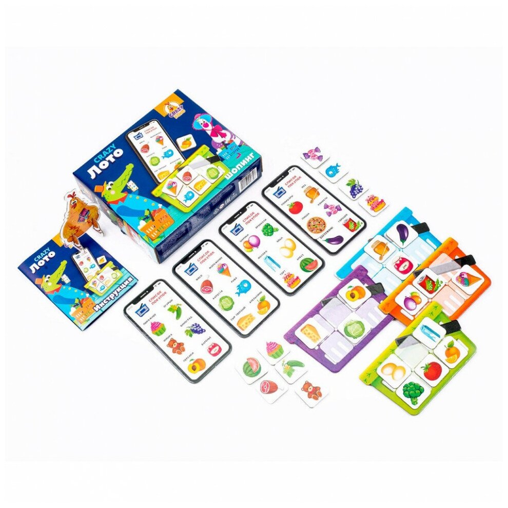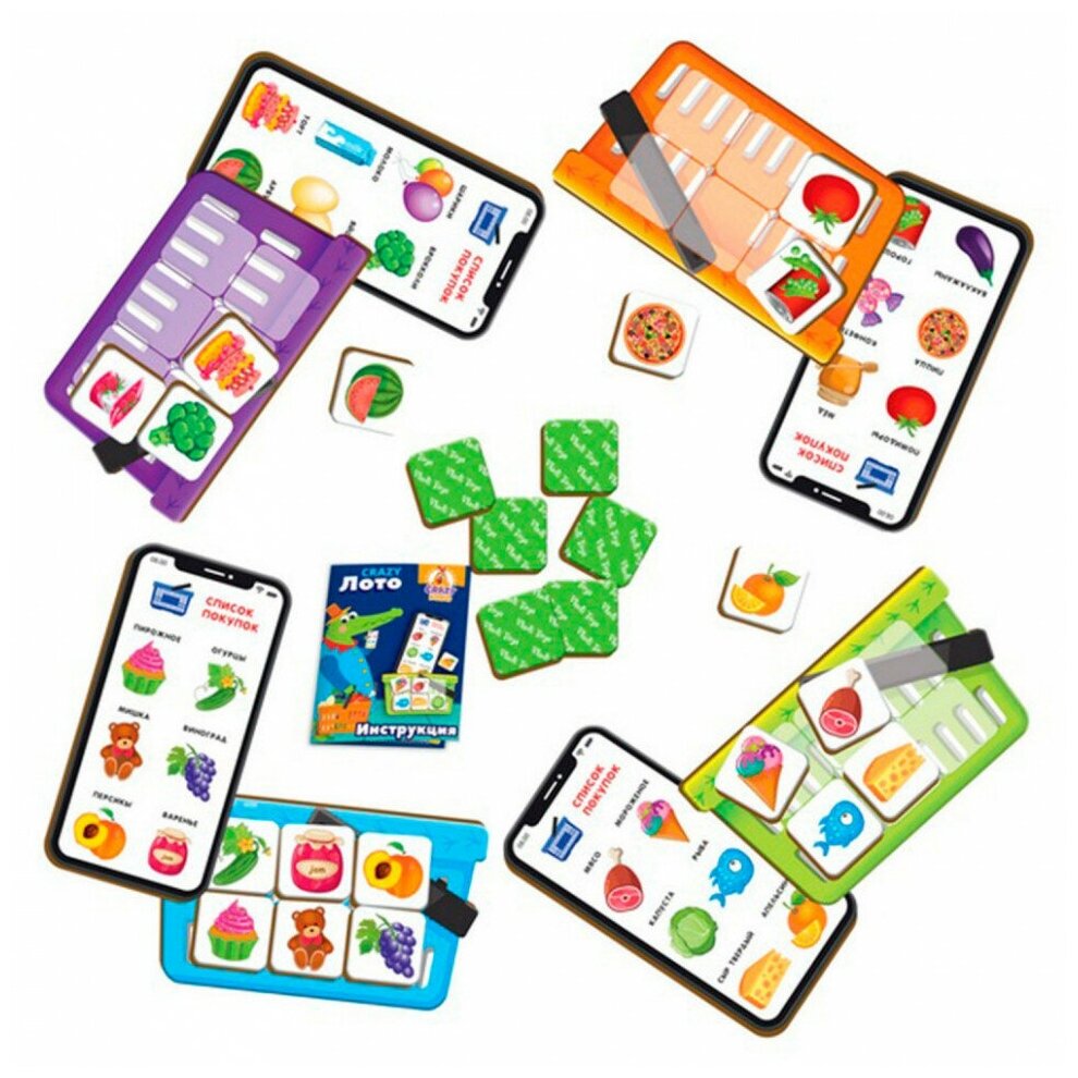 Хочешь отправиться с друзьями на самый веселый в мире шопинг? Загляни в смартфон - там уже есть список покупок! Кто быстрее справится и соберет все необходимые продукты? Давай узнаем! Лото - это всегда весело и интересно. А правила игры очень простые! Все фишки с продуктами положите на стол рубашкой вверх и перемешайте. Далее распределите между собой списки покупок и корзинки. По очереди переворачивайте фишки. Если вы вытащили нужный вам продукт - забирайте себе! Кто быстрее заполнит свою корзинку, тот и победит! Все детали изготовлены из прочного картона. Они очень легкие, поэтому игру удобно брать с собой, например, в путешествие. Игра развивает логическое мышление, память и внимание. А главное - дарит хорошее настроение!В комплекте 4 списка покупок 4 основы 28 деталей