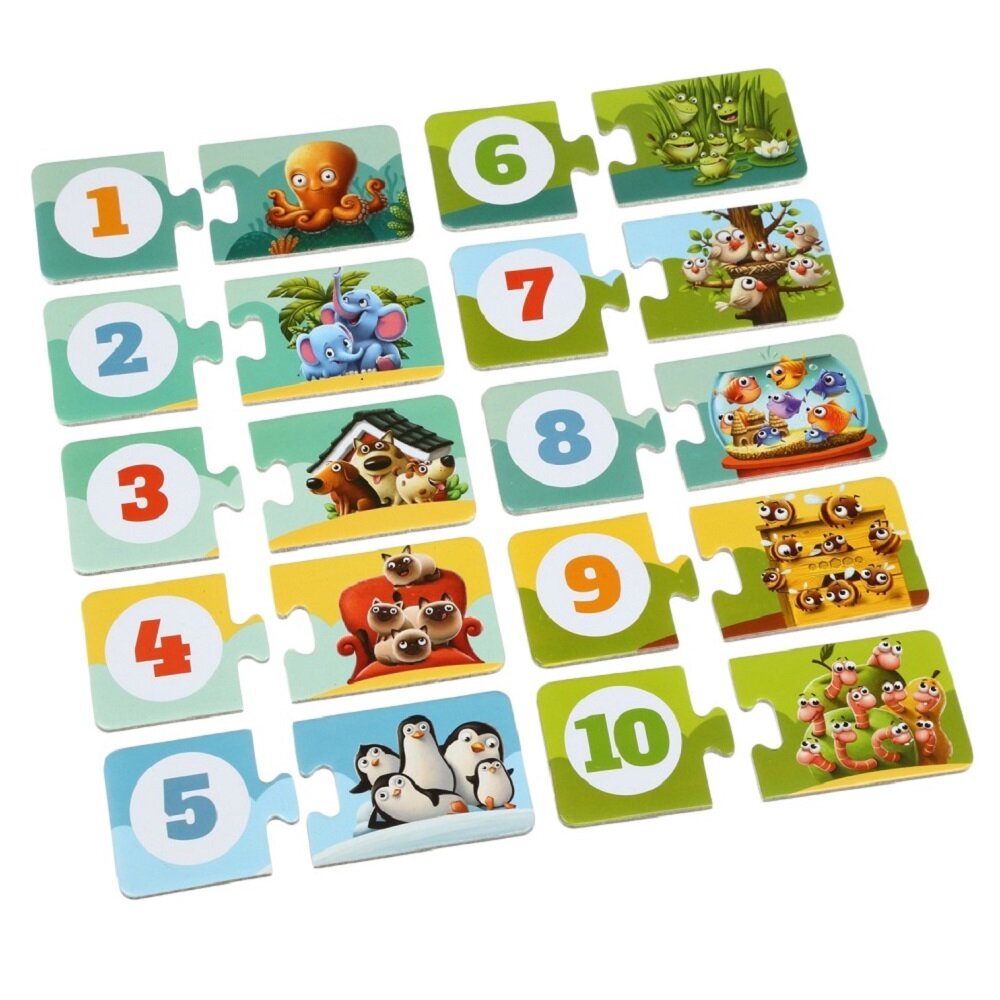Эти пазлы не просто сборка картинки, необходимо, чтобы было соответствие между цифрами и изображениями животных: 1 – одно животное, 2 – два животных и так до десяти. С помощью пазлов можно учить деток логике, цифрам, последовательности, показывать разных животных, где они живут и что едят.