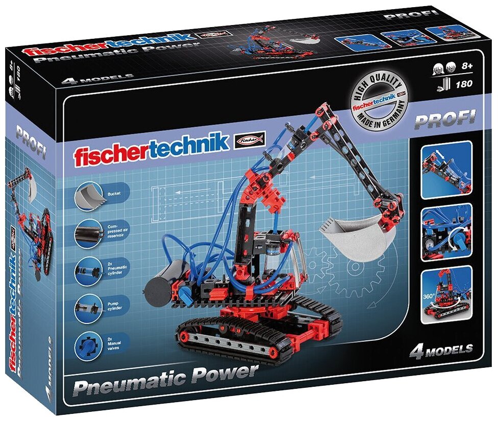 Новый недорогой набор «Основы пневматики» прекрасно продемонстрирует основы пневматики в процессе игры. С его помощью дети легко изучат поведение пневматических систем, узнают, как работает пневматический насос, цилиндры и ручные распределительные клапаны. Сжатый воздух нагнетается в пневмосистему с помощью ручного насоса. Затем он поступает в пневматические цилиндры, которые приводят в движение различные механизмы. Для распределения сжатого воздуха используются маленькие ручные клапаны. Из конструктора можно собрать экскаватор и еще четыре увлекательных модели. Дополнительно: Единый список деталей и модель Рабочая тетрадь