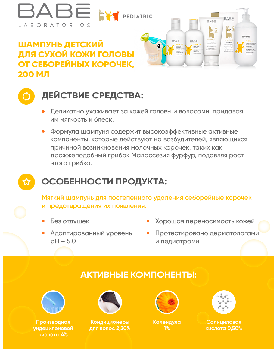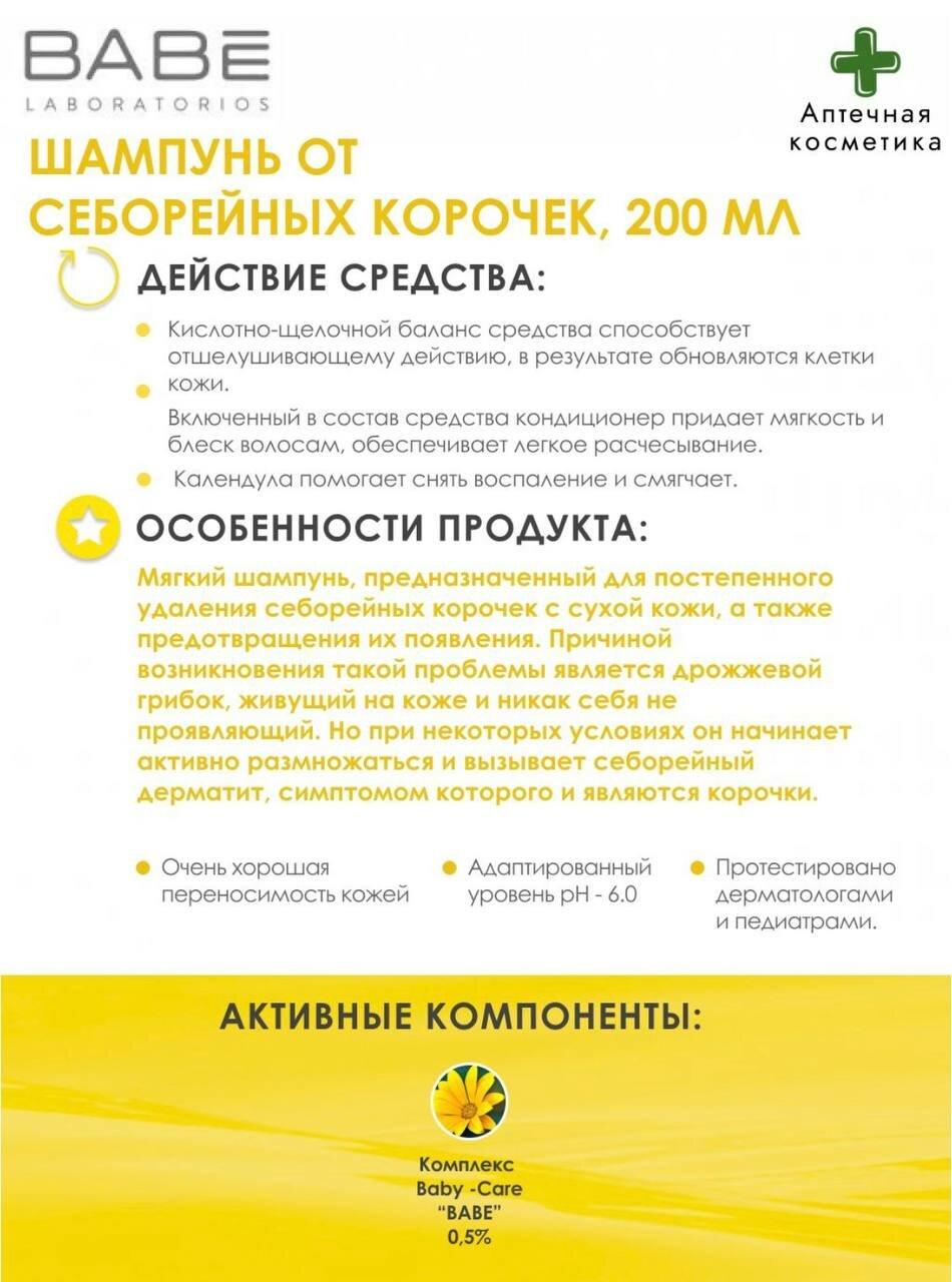 Формула шампуня содержит высокоэффективные активные компоненты, которые действуют на возбудителей, являющихся причиной возникновения молочных корочек, таких как дрожжеподобный грибок Малассезия фурфур, подавляя рост э