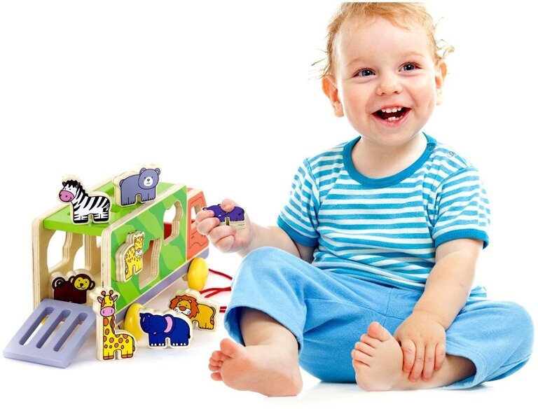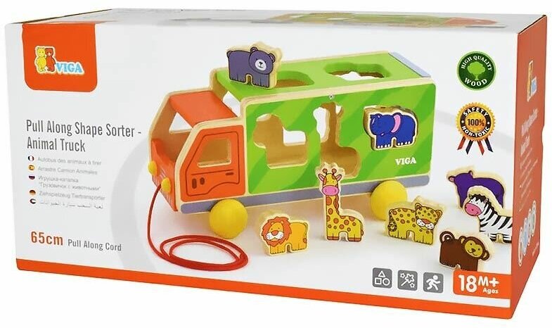 Игрушка из дерева состоит из грузовика и фигурок животных. Это замечательный сортер, каталка, а фигурки животных могут стоять, что позволяет играть с ними отдельно.