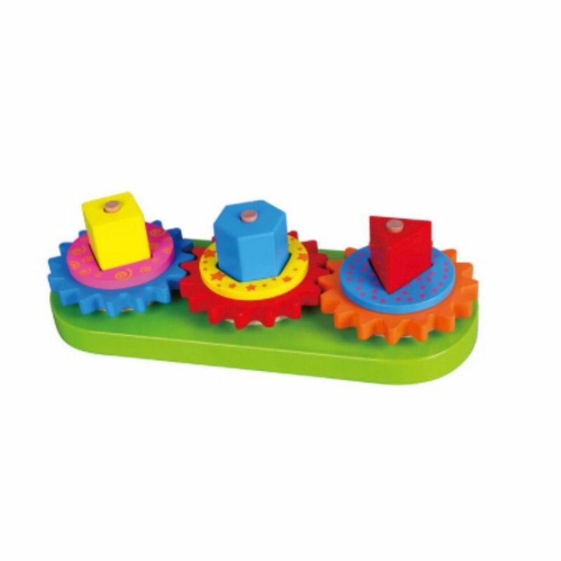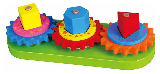 Эта красочная деревянная игрушка состоит из геометрических блоков, шестерней, шайб и колец. Малыш увлекательно проведет время, подбирая и нанизывая элементы на стержни основы, вращая блоки и шестерни и наблюдая за их взаимодействием. Игрушка знакомит с цветами, формами предметов, развивает логическое мышление и моторику рук.