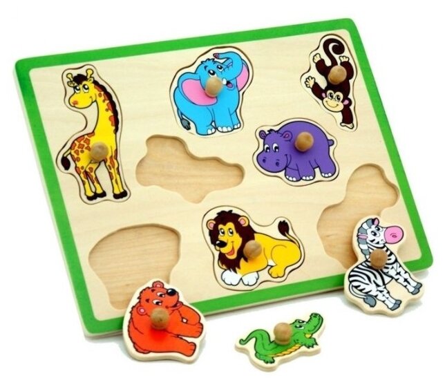 Пазл-вкладыш Viga Toys Дикие животные (50019) - простой и яркий деревянный пазл, специально созданный для тренировки физической и умственной активности малыша. Рекомендован для обучения по методике Монтессори, в детских садах и центрах развития. Подходит для инклюзивного образования.Особенности учебного набора:- прямоугольная деревянная доска содержит вырезанные контурные выемки для 8 соответствующих вкладышей в форме приветливых диких животных: жирафа, слона, обезьяны, крокодила, бегемота, медведя, льва и зебры;- рукоятка поможет ребенку держать и переносить вкладку, не спутав лицевую сторону с оборотом.Все элементы выполнены из экологически чистого сертифицированного бука и окрашены нетоксичными красителями. Их края сглажены, а поверхности тщательно отшлифованы. Продукция отвечает стандартам качества и безопасности детских игрушек: европейскому EN71 и американскому ASTM.Игрушки от именитого бренда применяют в детских садах, центрах развития, а некоторые даже при подготовке к школе.
