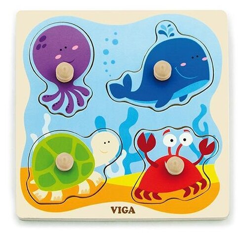 Развивающий пазл-вкладыш Море ТМ Viga Toys для детей от 18 месяцев познакомит мальчиков и девочек с морскими животными, обучит восприятию форм и чувству пространства, стимулируя разные виды чувств: жесты и прикосновения.Данный пазл-вкладыш развивает сенсорику, мелкую моторику, зрительно-моторную координацию, логику и воображение. Малыш учится думать и фантазировать в игровой форме.Деревянный вкладыш для малышей в виде забавных морских животных состоит из 4 деревянных пазлов с ручками: задача ребенка собрать целый пазл из имеющихся деталей, сопоставив не только картинку, но и соответствующую форму. Пазл никого не оставит равнодушным и отлично подойдет для знакомства с цветом и формами предметов. Вкладыши приятные и гладкие на ощупь, все края и детали отшлифованы. Благодаря ручкам на каждом пазле, ребенку удобно их удерживать в руке.Все детали игрушки гипоаллергенны, изготовлены из качественной древесины и покрыты нетоксичными красками.