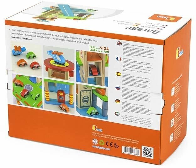 Деревянный Двухуровневый гараж с аксессуарами от компании Вига - это одна из лучших игрушек, которая будет служить долго и обеспечит Вашему ребенку много лет интересной и творческой игры. Благодаря этой игрушке ребенок сможет создавать свои собственные сценарии для игр. Красочный гараж с аксессуарами радует глаз и призывает к веселью. В нижней части находится автозаправочная станция, на которой можно заправить автомобиль. Чтобы попасть на первый этаж гаража, можно воспользоваться лифтом, или подняться самостоятельно. На вершине расположена площадка для вертолета.
