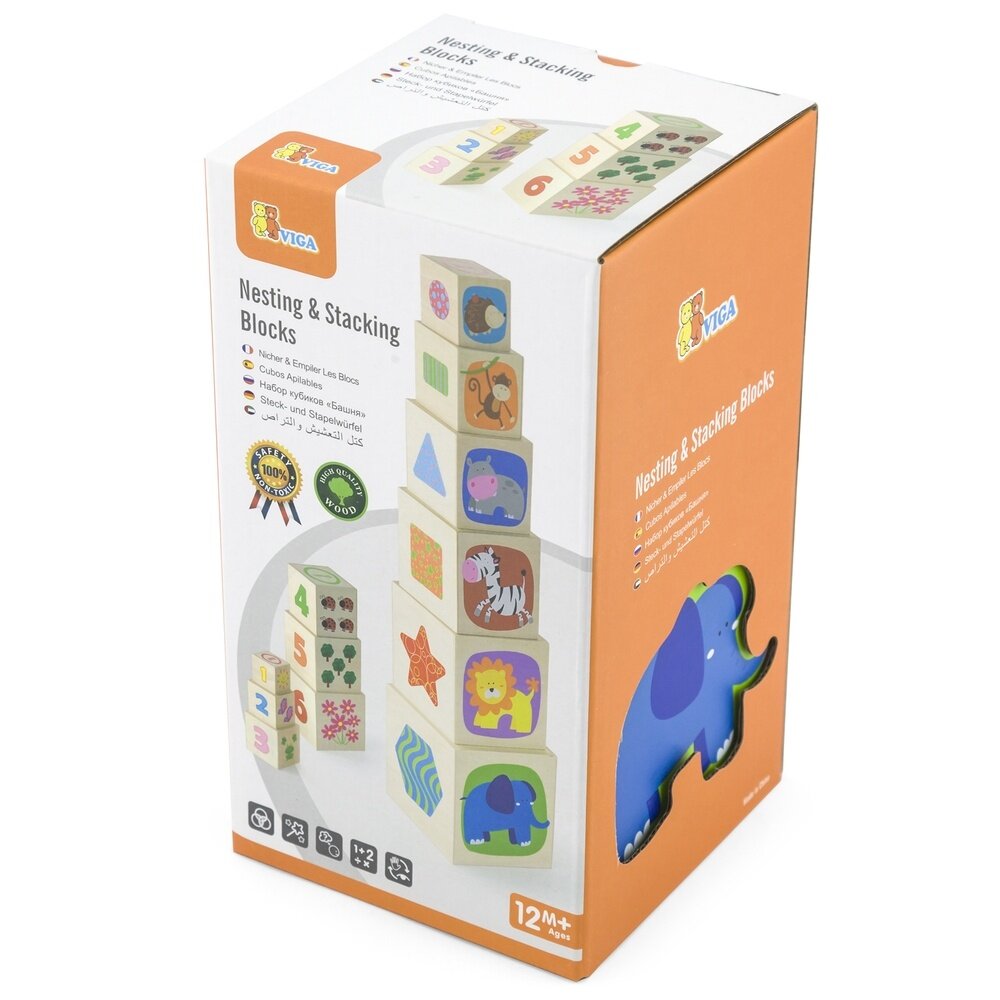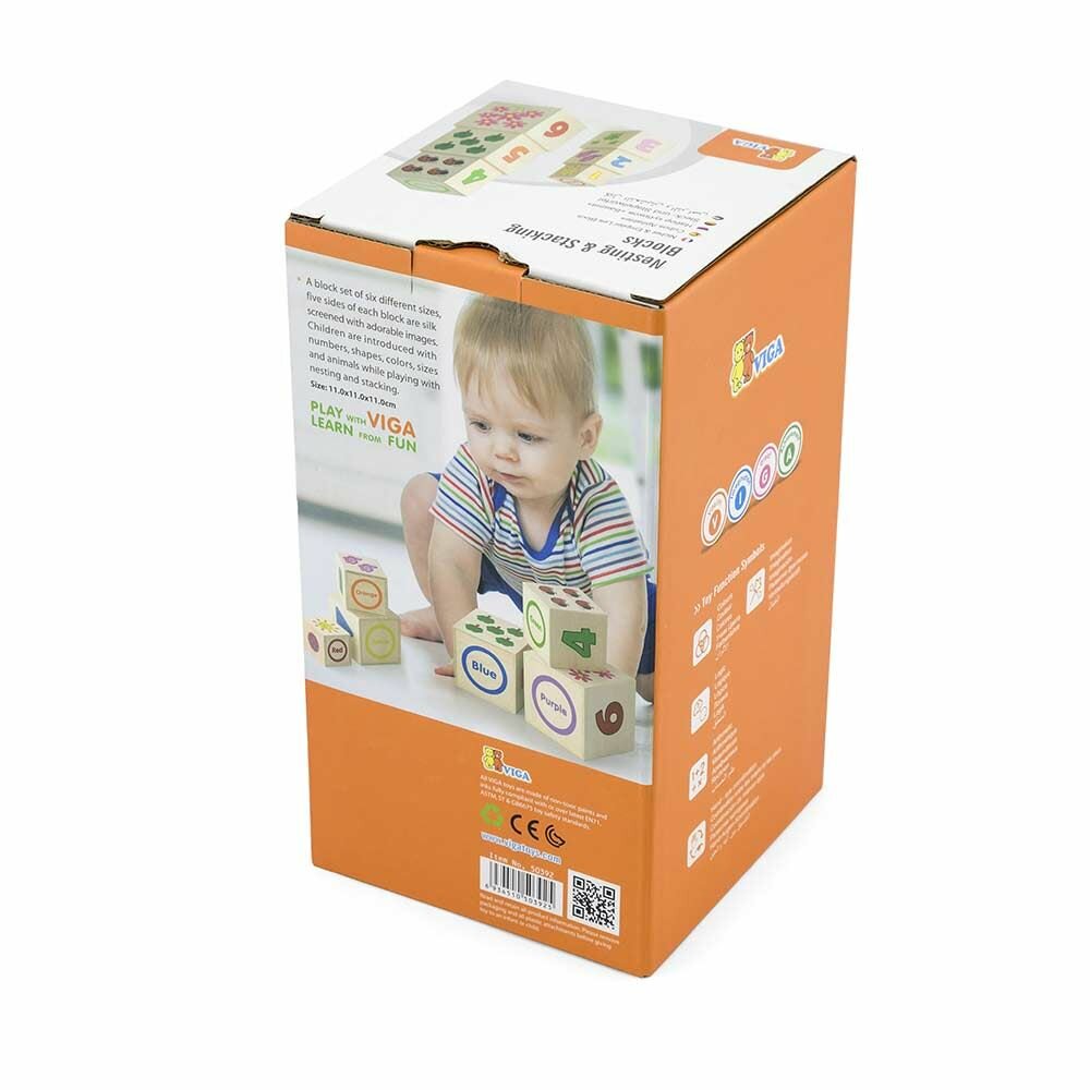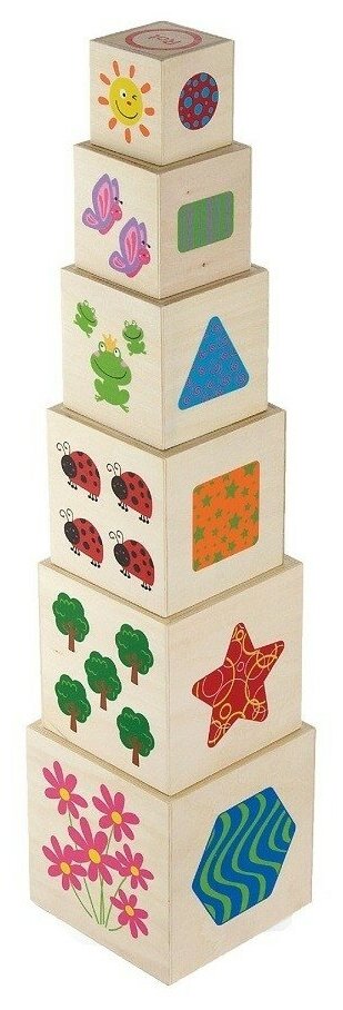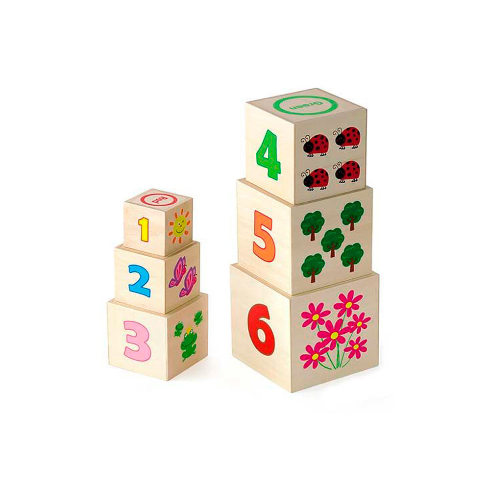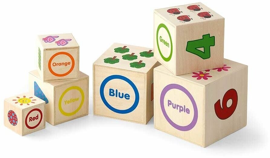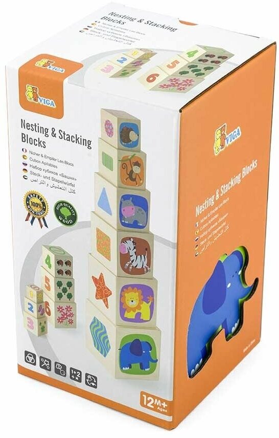 6 красочных деревянных блоков, напечатанных вручную с животными, фигурами, садом и цифрами. Поощряет ранний подсчет от одного до шести. Может быть сложена и вложена.