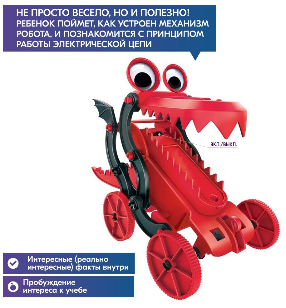 Соберите робота-дракона, который ползает по полу и открывает свои огненные челюсти. Полезный набор, который поможет не увлечь игрой, но и изучить механизм работы игрушки.