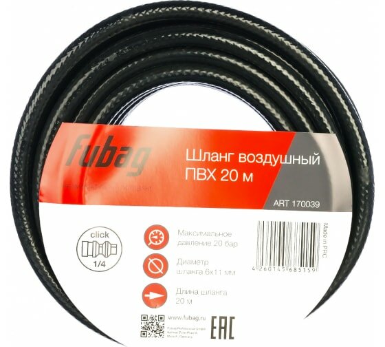 Изделие Fubag 170039 имеет прямую форму и весит 2.3 кг. Соединение осуществляется при помощи фитингов рапид при наличии 6-миллиметрового внутреннего диаметра и внешнего диаметра, равного 1.1 см. Общая длина шланга составляет 20 м. Изделие способно выдержать давление в 20 Бар.