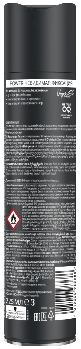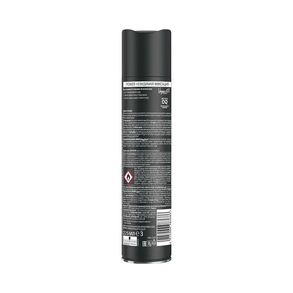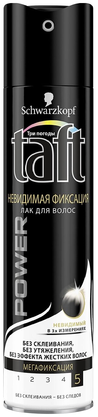 "Формула Taft Power Невидимая Фиксация обеспечивает невидимую фиксацию в трех измерениях: без склеива- ния, без утяжеления, без эффекта жестких волос! • Фиксация укладки до 3 дней без склеивания и следов. • Помогает защитить волосы от пересушивания, не утяжеляя их. "Состав:"Alcohol denat. (50,5 % Vol.) · Dimethyl Ether · Aqua · Octylacrylamide/Acrylates/Butylaminoethyl Methacrylate Copolymer · Aminomethyl Propanol · Vinyl Caprolactam/VP/Dimethylaminoethyl Methacrylate Copolymer · Panthenol · Benzophenone-4 · Tocopheryl Acetate · Parfum · Isopropyl Myristate · PEG/PPG-18/18 Dimethicone · Benzyl Salicylate · Citronellol · Linalool · Geraniol · Hexyl Cinnamal · Benzyl Alcohol · Eugenol"Условия хранения: от - 5 С до + 40 С