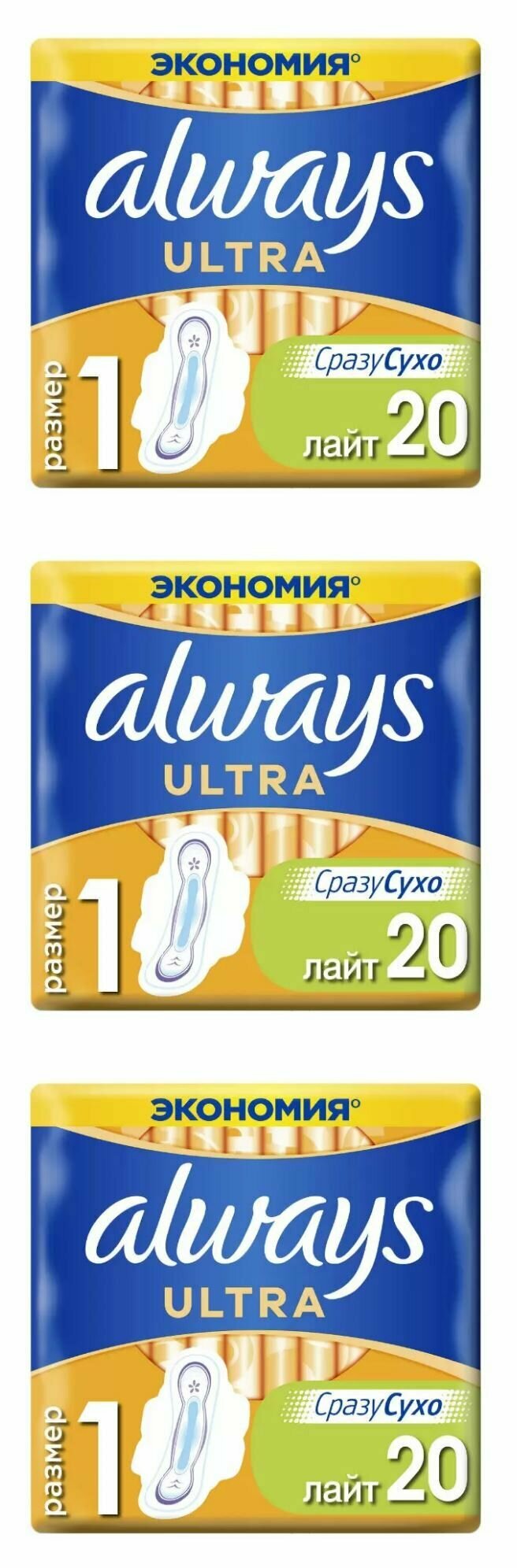 Тройная защита от Always не соглашайтесь на меньшее: в Always Ultra Light (Размер 1) с крылышками используется новейшая технология для создания многофункциональной гигиенической прокладки с 3 элементами защиты. Система Сразу сухо впитывает влагу за считаные секунды и не дает ей соприкасаться с кожей. Технология Защитные барьеры удерживает жидкость, предотвращая протекания. Технология Блок запаха нейтрализует неприятные запахи, придавая ощущение свежести и чистоты во время менструации. С Always Ultra вы можете чувствовать себя уверенно весь день. Тройная защита от Always не соглашайтесь на меньшее. Формула дерматологически одобрена Ассоциацией здоровья кожи (Skin Health Alliance). Попробуйте Always Ultra Secure Night Extra с крылышками лучшие гигиенические прокладки Always для защиты в ночное время. Обеспечьте себе наилучшую защиту с помощью Always My Fit специальной системы определения размера, которая помогает правильно подобрать прокладку ALWAYS на основании количества выделений и размера трусиков. Супервпитывающий внутренний слой с системой Сразу сухо, которая впитывает жидкость за считаные секунды. Технология Защитные барьеры удерживает жидкость, предотвращая протекания. Технология Блок запаха нейтрализует неприятные запахи. Гигиенические прокладки не раздражают кожу (доказано дерматологами). Крылышки помогают удерживать прокладку на месте для надежной защиты и ощущения комфорта.