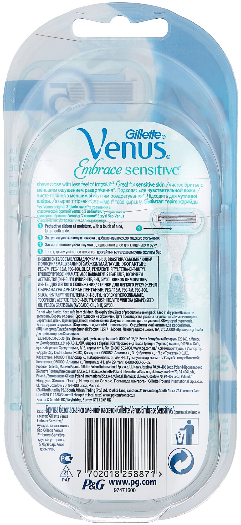 Ищете бритву для чувствительной кожи? Попробуйте женскую бритву Gillette Venus Embrace Sensitive. Эта бритва была протестирована дерматологами. Доказано, что она обеспечивает более гладкое бритье и уменьшают раздражение кожи (по сравнению с Simply Venus 2). Включает пять лезвий для комфортного бритья с защитной увлажняющей полоской с алоэ.