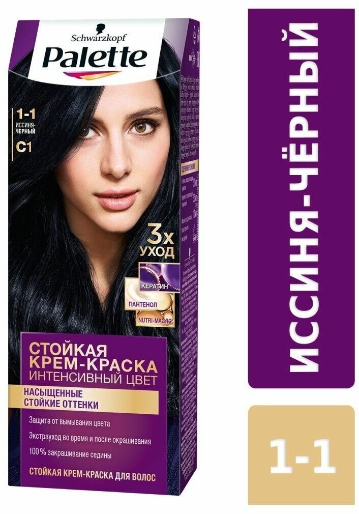 Откройте для себя стойкую крем-краску Palette с Кератин-Комплексом для неизменно насыщенного цвета, превосходного закрашивания седины и стойкого результата. В сочетании с новой Маской-уходом с Кератин-комплексом, средства линии «Интенсивный цвет» становятся идеальным оружием в борьбе за красоту, силу и здоровье ваших волос.Теперь Ваши волосы до 2 раз более ухоженные*, сильные, гладкие и поразительно блестящие.*по сравнению с предыдущей формулойКрем-краска для волос Palette C1 (1-1) Иссиня-черный 110мл - стойкое средство для окрашивания волос. Формула с высокоинтенсивными пигментами проникает глубоко внутрь волоса, защищая цвет от вымывания. Стойкий насыщенный цвет надолго и 100% закрашивание седины. Формула и маска-уход с тройной системой ухода с кератином, пантенолом и nutri-маслом обеспечивают бережную заботу о волосах. Краска укрепляет, разглаживает волокна волос и наполняет их цветом для роскошного стойкого оттенка.
