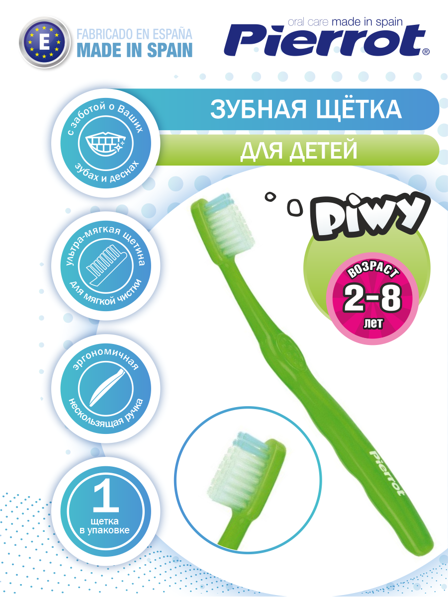 Зубная щетка детская Пиви Pierrot для детей от 2 до 6 лет. Особенности щетки Pierrot PIWY: веселый дизайн небольшая головка мягкие щетинки эргономичная ручка разные цвета разные ароматы Щетка веселого дизайна в ярких тонах и эргономичная ручка идеально подходит для руки ребенка. Маленькая головка и округлые мягкие щетинки позволяют тщательно чистить зубы, защищая при этом десна. Ароматы фруктов - банан, клубника, яблоко. Бренд: Pierrot (Испания)