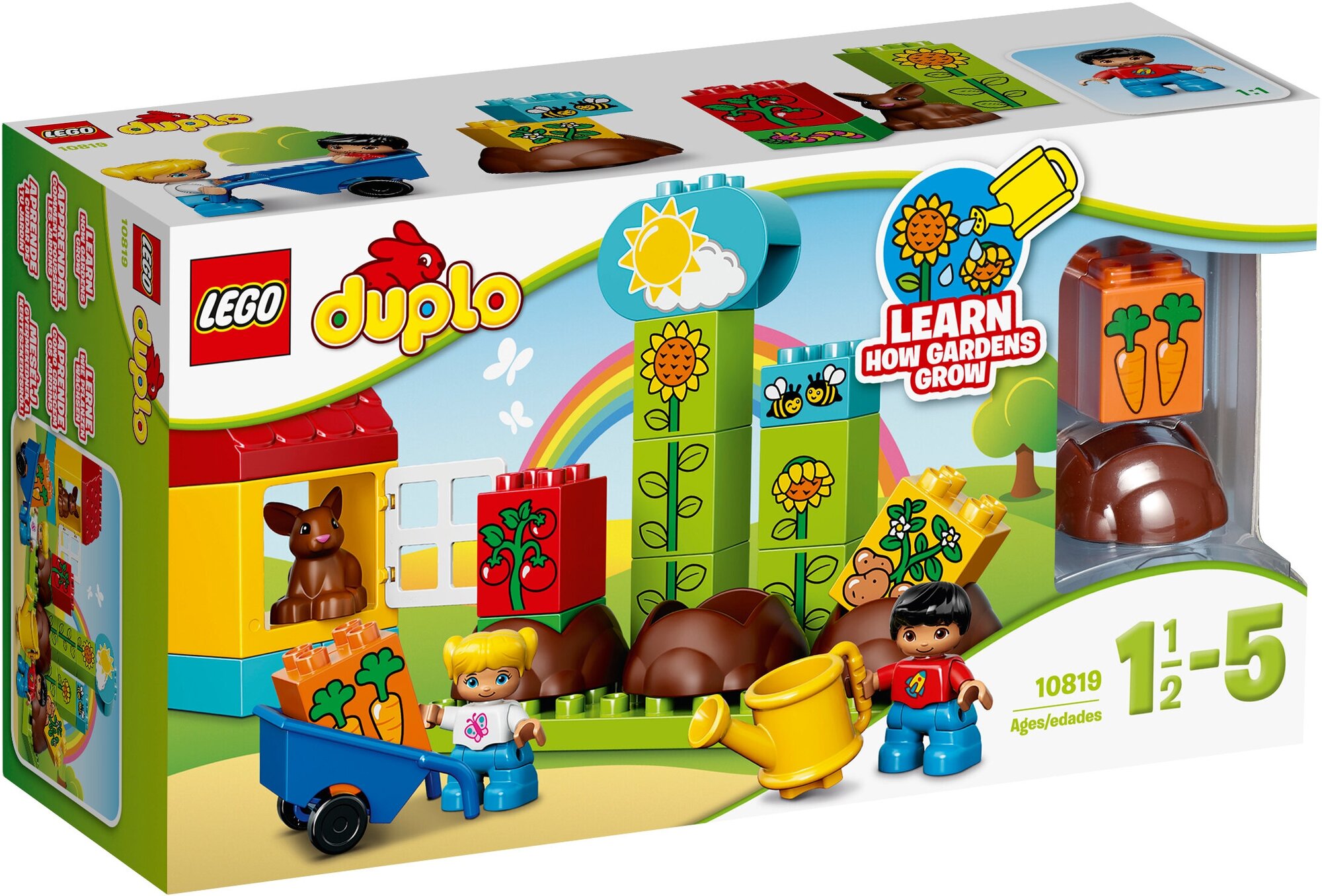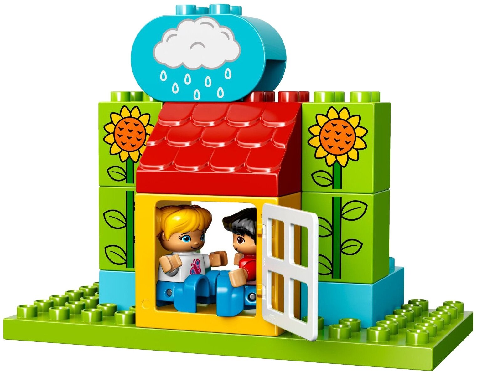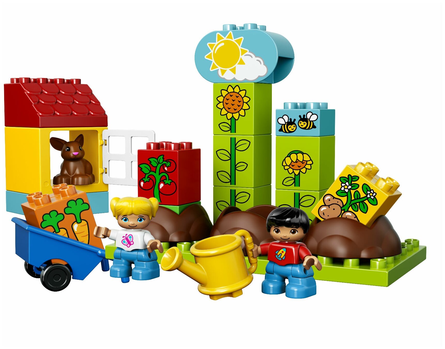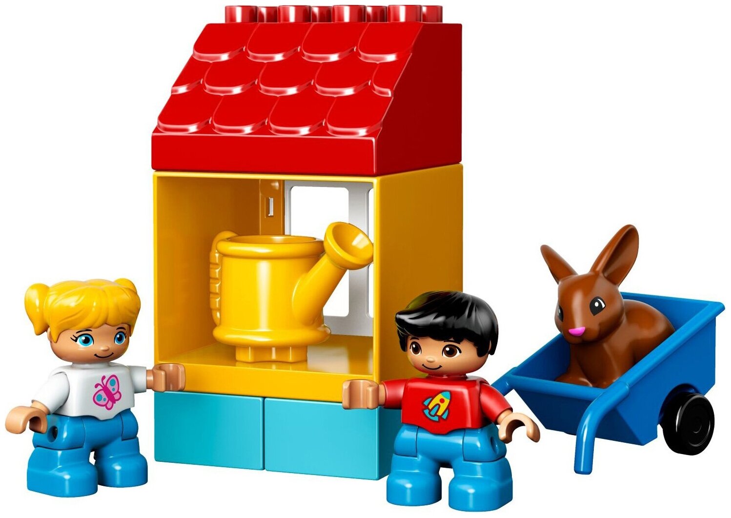 Конструктор Lego DUPLO Мой первый сад сможет заинтересовать малыша. Маленькие и красочные детальки помогут ему обустроить садик. В компании игрушечных мальчика и девочки ребенок познакомится с основами садоводства: узнает, как происходит процесс выращивания растений. Для полива есть специальная лееечка, подсолнушки стоит посадить на солнечной стороне. Выращенную морковку можно положить в тачку на колесиках, в которой иногда сидит красивый кролик. А если вдруг пойдет дождик, юные фермеры смогут спрятаться в домике и наслаждаться своим урожаем. Пусть Ваш малыш поможет ребятам вырастить вкусные помидоры, картофель и морковку! Игра с конструктором поможет развить крохе мелкую моторику рук и воображение. Lego DUPLO сделает детство Вашего ребенка насыщенным и ярким!