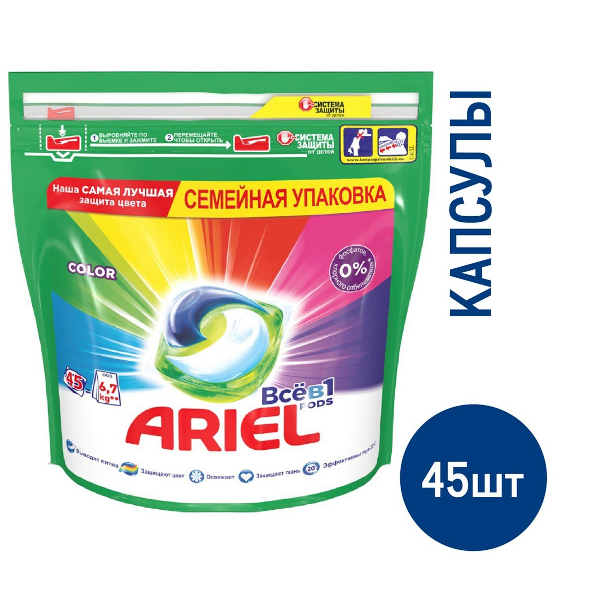 Капсулы гелевые для стирки ARIEL COLOR, 45х27 г содержат концентрированный гель для машинной стирки одежды и подходят для цветного и белого белья. Продукт включает три активных компонента, которые способствуют эффективной очистке, удалению старых пятен и смягчению тканей. Капсулы отличаются простотой использования: их следует поместить в барабан машинки, после чего сверху загрузить текстиль. Оболочка капсулы растворяется при попадании воды, ингредиенты смешиваются и гарантируют эффективное очищение одежды даже при температуре 30 градусов. Средство отлично выполаскивается, не оставляет белых полос или разводов на ткани. После стирки вещи приобретают приятный свежий, но ненавязчивый аромат, который стойко держится. Состав: >30% Anionic Surfactants 5-15% Soap Количество: 45 шт по 27 г.Температурный режим применения: от 30С до 95С.Срок годности: 12 месяцев.Бренд: ARIEL.
