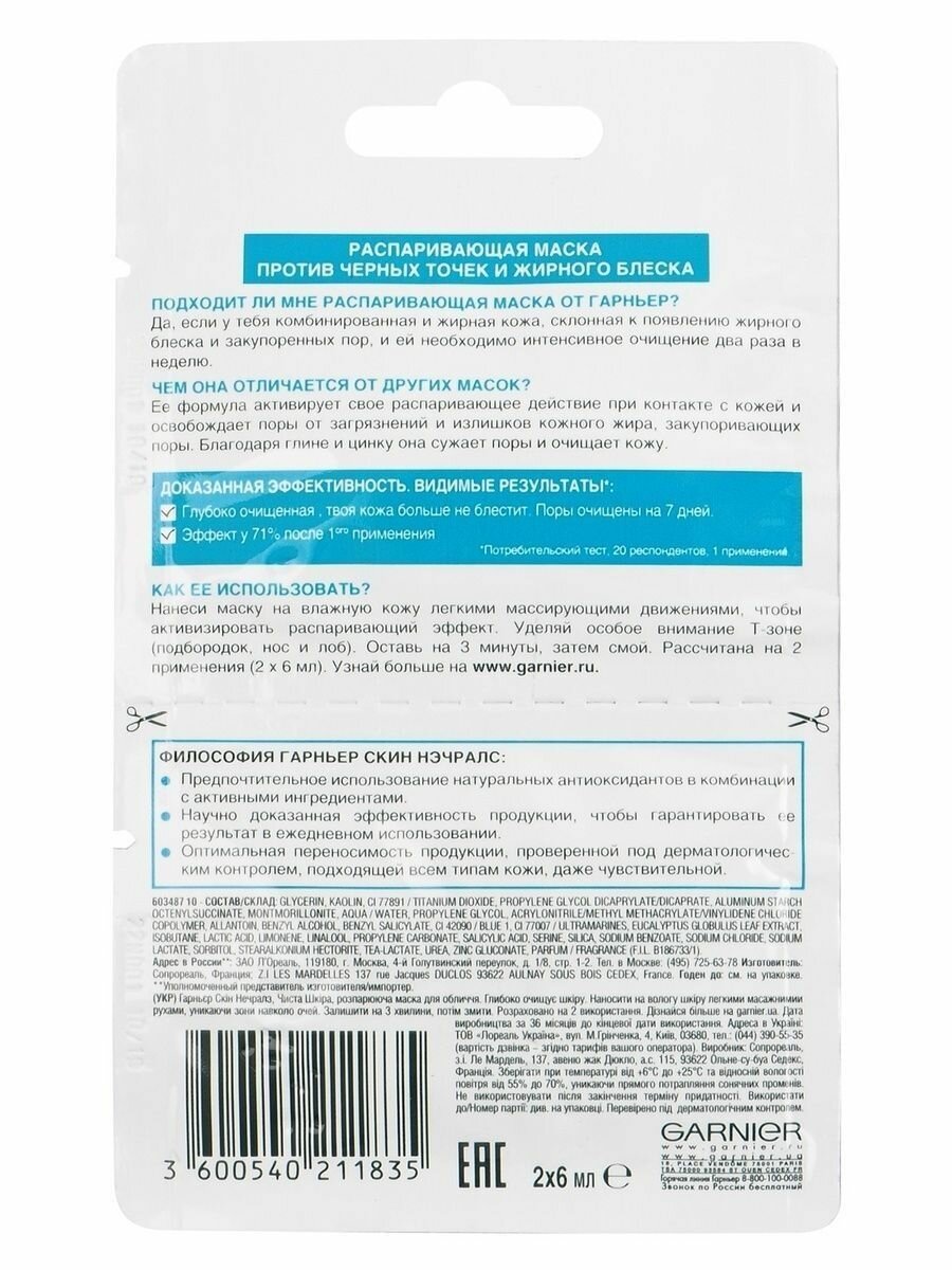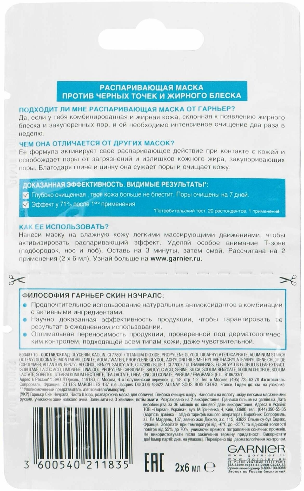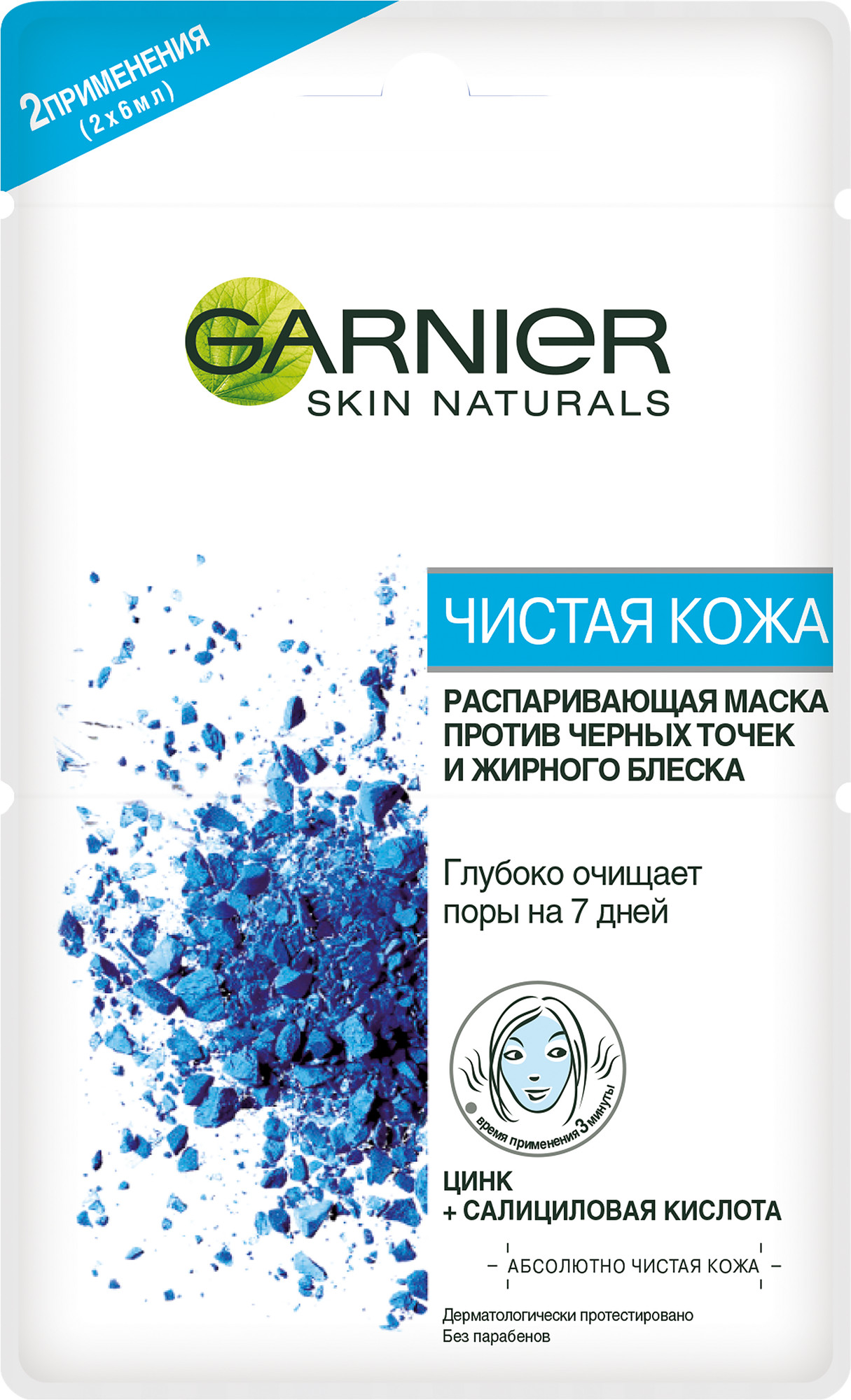 Маска для лица Garnier Skin Naturals Чистая Кожа для жирной склонной к появлению несовершенств кожи 2х6 мл (C1718707)