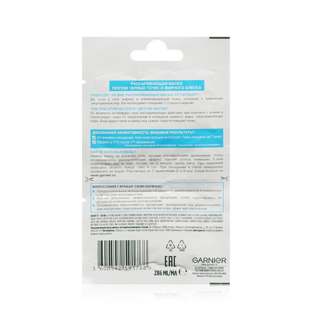 | Способ применения | Нанести маску на влажную кожу легкими массирующими движениями, чтобы активизировать распаривающий эффект. Особое внимание уделить зонам лба, носа, подбородка. Оставить на 3 минуты и тщательно смыть водой. Использовать 2 раза в неделю. Одна упаковка рассчитана на 2 применения |