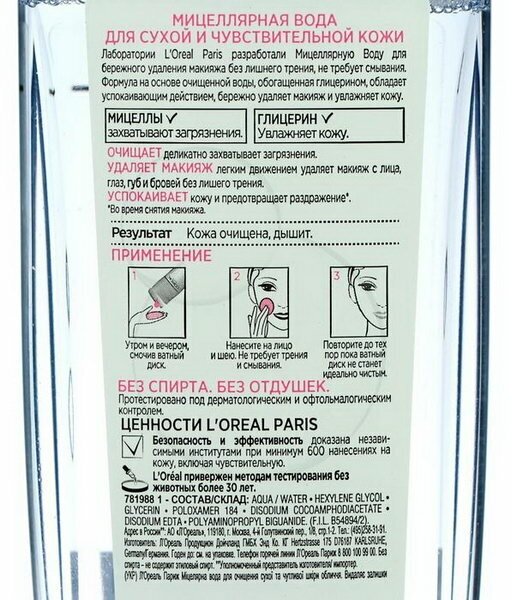 Описание товара:Мицеллярная вода для кожи эффективно и бережно удаляет макияж и загрязнения без трения благодаря мицеллам, захватывающим загрязнения. Средство обладает успокаивающим действием. Без лишнего трения мицеллярная вода бережно очищает кожу лица, губ и деликатную область вокруг глаз. Мицеллярная вода для лица- это больше, чем просто удаление макияжа и очищение. Формула на основе очищенной воды, обогащенная глицерином, обладает успокаивающим действием, бережно удаляет макияж.Состав товара:Aqua/water, hexylene glycol, glycerin, poloxamer 184, disodium cocoamphodiacetate, disodium edta, polyaminopropyl biguanide.Меры предосторожности:Хранить в недоступном для детей месте. Не употреблять внутрь.Способ применения:Мицеллярная вода для кожи наносится с помощью ватного диска, плавными круговыми движениями. 1. Используйте ежедневно утром и вечером. Смочите ватный диск Мицеллярной Водой. 2. Легкими круговыми движениями очистите кожу лица и губ. Не требует трения и смывания. 3. Для снятия макияжа с глаз приложите смоченный ватный диск к закрытым глазам на несколько секунд, затем аккуратно удалите остатки макияжа.