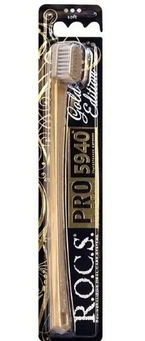 Зубная щетка R.O.C.S. PRO 5940 Gold Edition это новая эксклюзивная гамма цветовых сочетаний золота и черного бархата в дизайне щетины, ручки и блистера предоставляет возможность каждому выбрать зубную щетку наиболее привлекательную именно для него и отражающую его индивидуальность. Специально спроектированная тонкая изогнутая форма ручки предотвращает излишнее давление на десны и обеспечивает удобство во время чистки зубов.