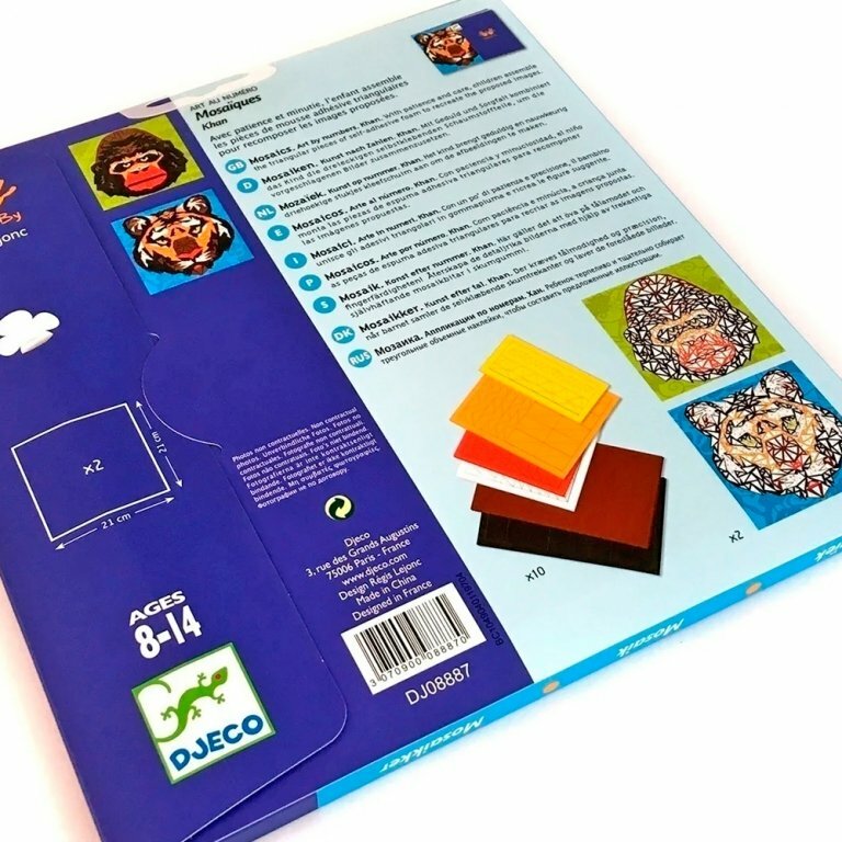 Мягкая мозаика Хан от французского производителя Джеко обеспечит увлекательный досуг для вашего ребенка. Она включает в себя две картинки с изображением тигра и гориллы, мягкую мозаику треугольной формы на липкой основе и пошаговую инструкцию. Для того, чтобы собрать красочное изображение, необходимо просто отклеить элементы мозаики и, следуя инструкции, поочередно поместить их на шаблон. Характеристики:В наборе: 2 картонные основы, 15 листов с мягкой мозаикой на липкой основе.Размер основы: 21*21 см.Материал: картон.Набор упакован в красочную картонную коробочку.Размер упаковки: 22*22*1 см.Продукция Djeco в первую очередь направлена на всестороннее развитие детей. Все товары бренда проходят специальную проверку психологов и, при необходимости, дорабатываются по их рекомендациям. Djeco - это сочетание высочайшего качества полиграфии и материалов с необычной идеей исполнения, для этого в создании игрушек и развивающих игр принимают участие более 30 профессиональных дизайнеров и художников. Игры Джеко направлены в том числе и на эстетическое воспитание и развитие у детей чувства прекрасного.Рекомендовано для детей от 8 до 14 лет.
