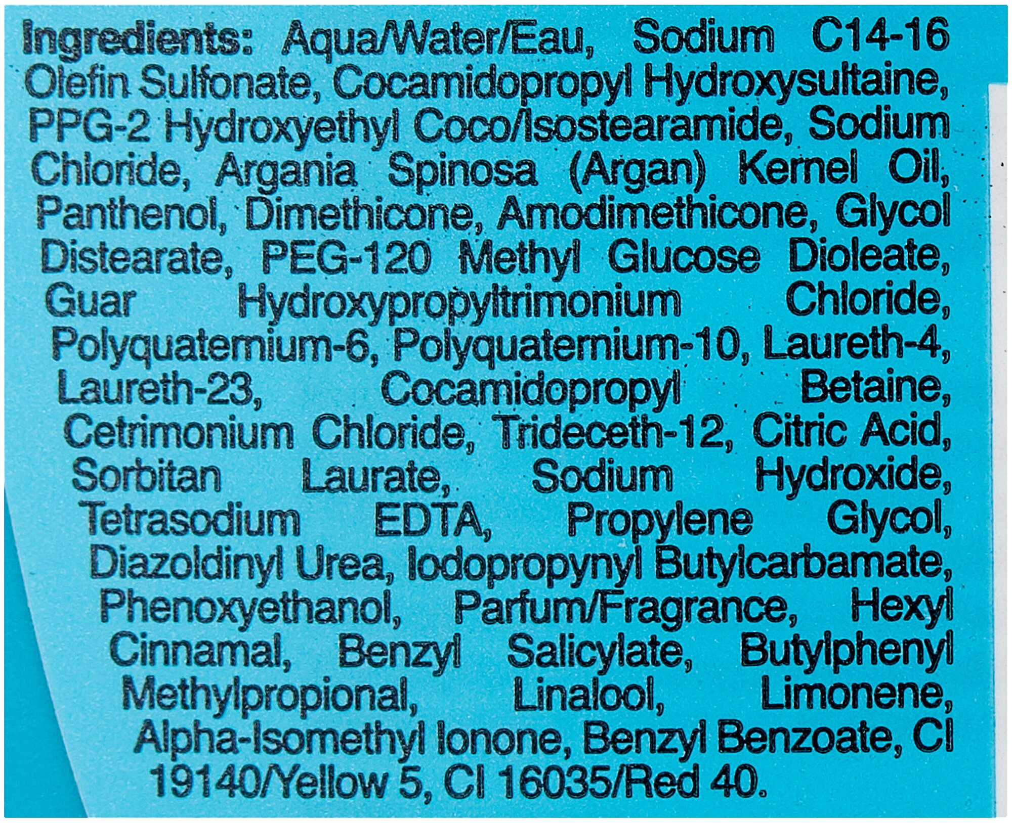 | Состав | вода; натрия с14-16 олефин сульфонат; кокамидопропил гидроксисултаин; кокоил изетионат натрия; ппг-2 гидроксиэтил коко/изостеарамид; аргановое масло (argania spinosa kernel oil); пантенол; диметикон; амодиметикон; стеарат гликоля; пэг-120 метил глюкозы диолеат; гуар гидроксипропилтримониум хлорид; поликватерниум-6; поликватерниум 10; лаурет-4; лаурет-23; кокамидопропилбетаин; цетримониум хлорид; тридецет-12; лимонная кислота; аромат; тетранатрий эдта/эдтк; хлорид натрия; диазолидинил мочевина; йодопропинил бутилкарбамат; желтый 5 (ci 19140); красный 40 (ci 16035). |