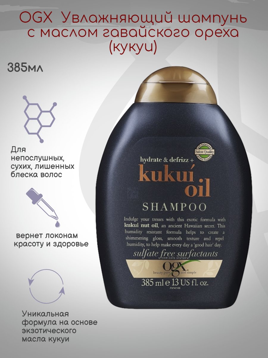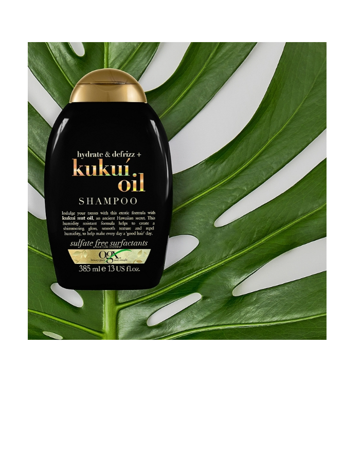 OGX — марка для тех, кто стремится к изысканности и заботится о красоте своих волос. Шампунь OGX с маслом гавайского ореха (кукуи) обладает разглаживающим эффектом, увлажняет волосы, придает им естественный блеск. Он сохраняет гладкость волос даже при высокой влажности. Увлажняющий шампунь OGX обладает потрясающим ароматом, который помогает погрузиться в мир удовольствия и наслаждения.