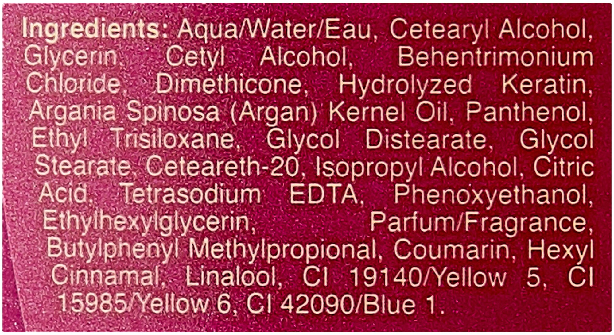 | Состав | aqua, cetearyl alcohol, cetyl alcohol, behentrimonium chloride, hydrolyzed keratin, argania spinosa kernel oil, glycerin, ppg-3 benzyl ether myristate, dimethicone, polyquaternium-47, steareth-20, disodium edta, isopropyl alcohol, citric acid, sodium hydroxide, sodium benzoate, parfum, yellow 5 (ci 19140), yellow 6 (ci 15985), blue 1 (ci 42090) |