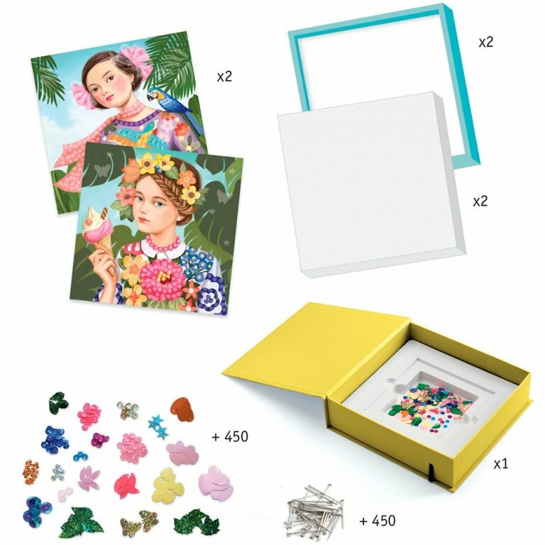Детский набор для творчества от Djeco предназначен для создания 2 красочных картин, которыми можно будет по-настоящему гордиться. На выбранный для декорирования шаблон ребёнку надо будет поместить пенопластовую основу и при помощи булавок приколоть пайетки, бусины и блёстки. Закончив украшение картины, готовую поделку необходимо обрамить деревянной рамкой - и можно наслаждаться получившимся шедевром! Занятие аппликацией поможет юным мастерицам развить свои творческие способности, художественный вкус, воображение и усидчивость.Характеристики:В наборе: коробочка для хранения и сортировки, 2 картинки, 2 пенопластовые основы для картин, 2 деревянные рамки, блестки, пайетки, булавки, бусины, инструкция.Размер основы картины: 21*21 см.Материал: картон, пенопласт.Упаковка: картонная коробка.Размер упаковки: 23.5*23*6.5 см.Продукция Djeco в первую очередь направлена на всестороннее развитие детей. Все товары бренда проходят специальную проверку психологов и, при необходимости, дорабатываются по их рекомендациям. Djeco - это сочетание высочайшего качества полиграфии и материалов с необычной идеей исполнения, для этого в создании игрушек и развивающих игр принимают участие более 30 профессиональных дизайнеров и художников. Игры Джеко направлены в том числе и на эстетическое воспитание и развитие у детей чувства прекрасного.Рекомендовано для детей от 8 лет.